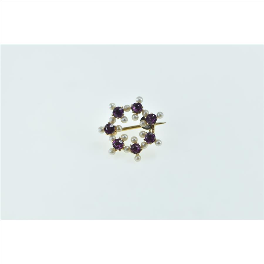 14K Purple Tourmaline Seed Pearl Round Vintage Yellow Gold Pin/Brooch