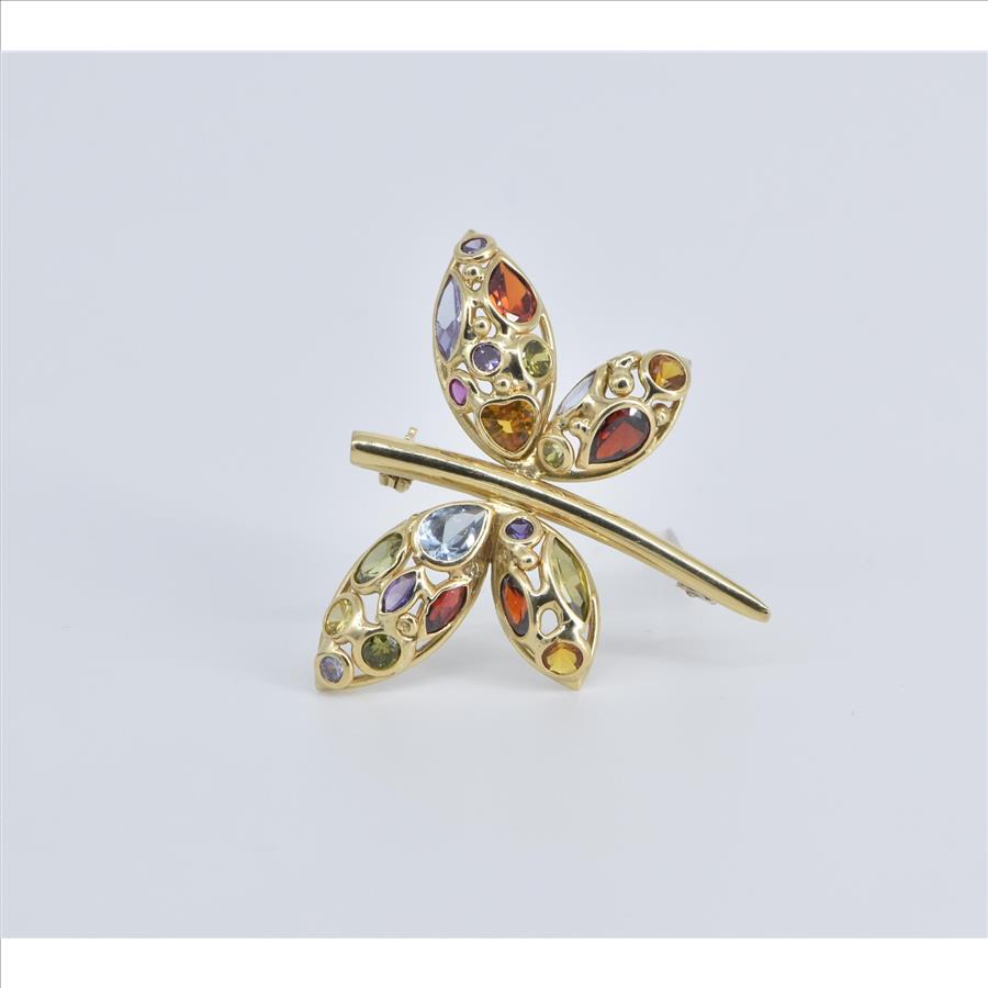 14K Rainbow Stone Encrusted Dragonfly Statement Yellow Gold Pin/Brooch