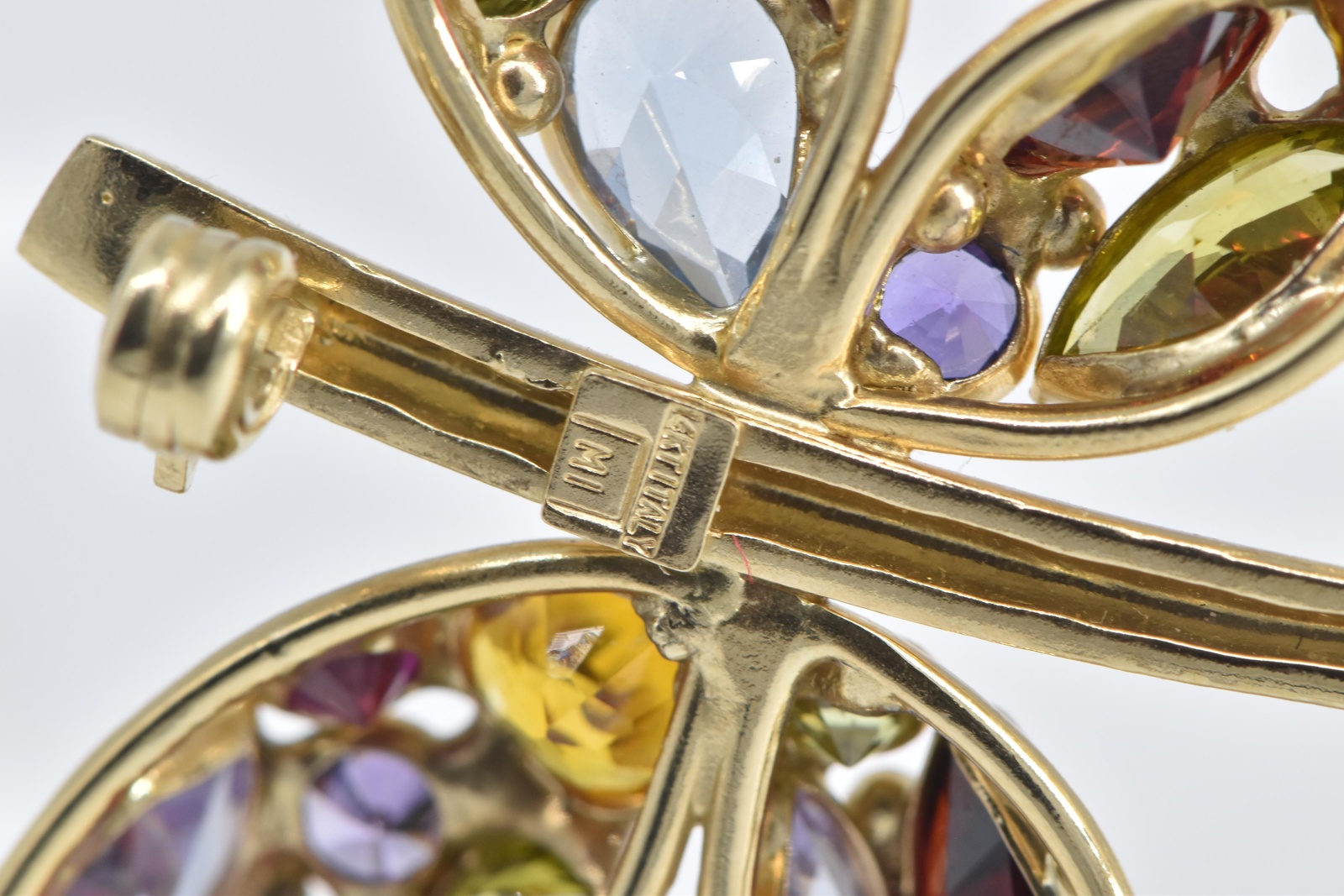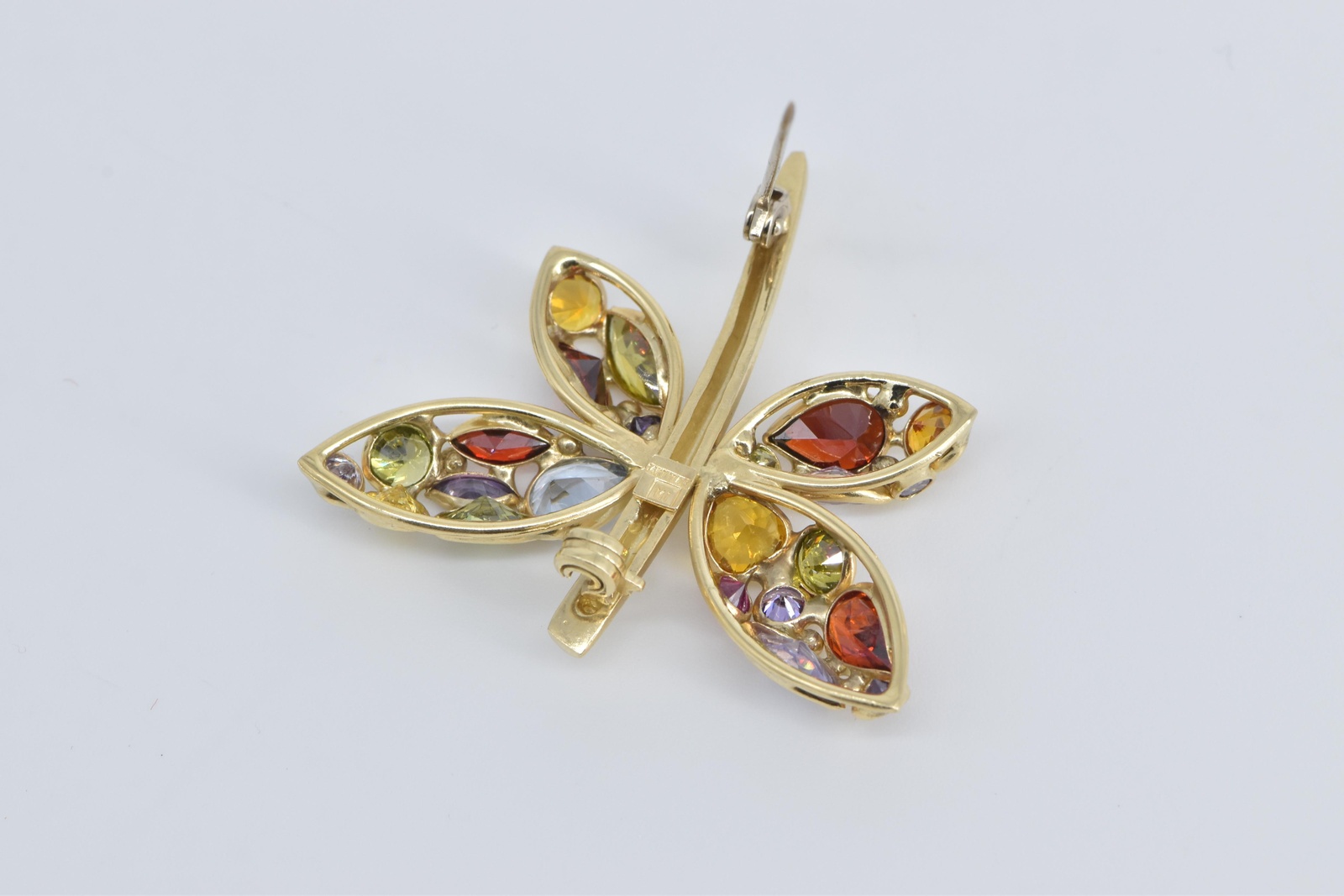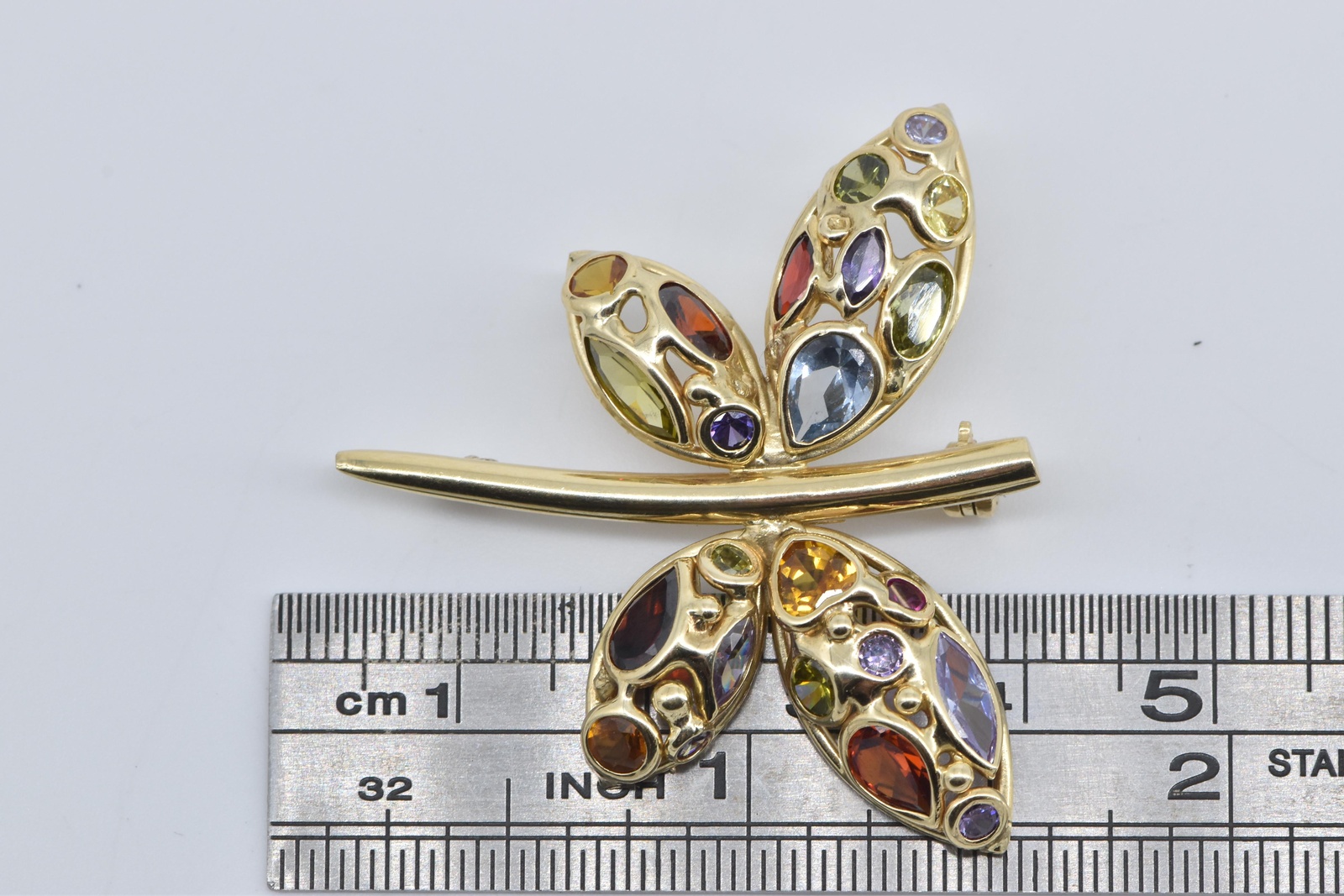 Item:  14K Rainbow Stone Encrusted Dragonfly Statement Yellow Gold Pin/Brooch