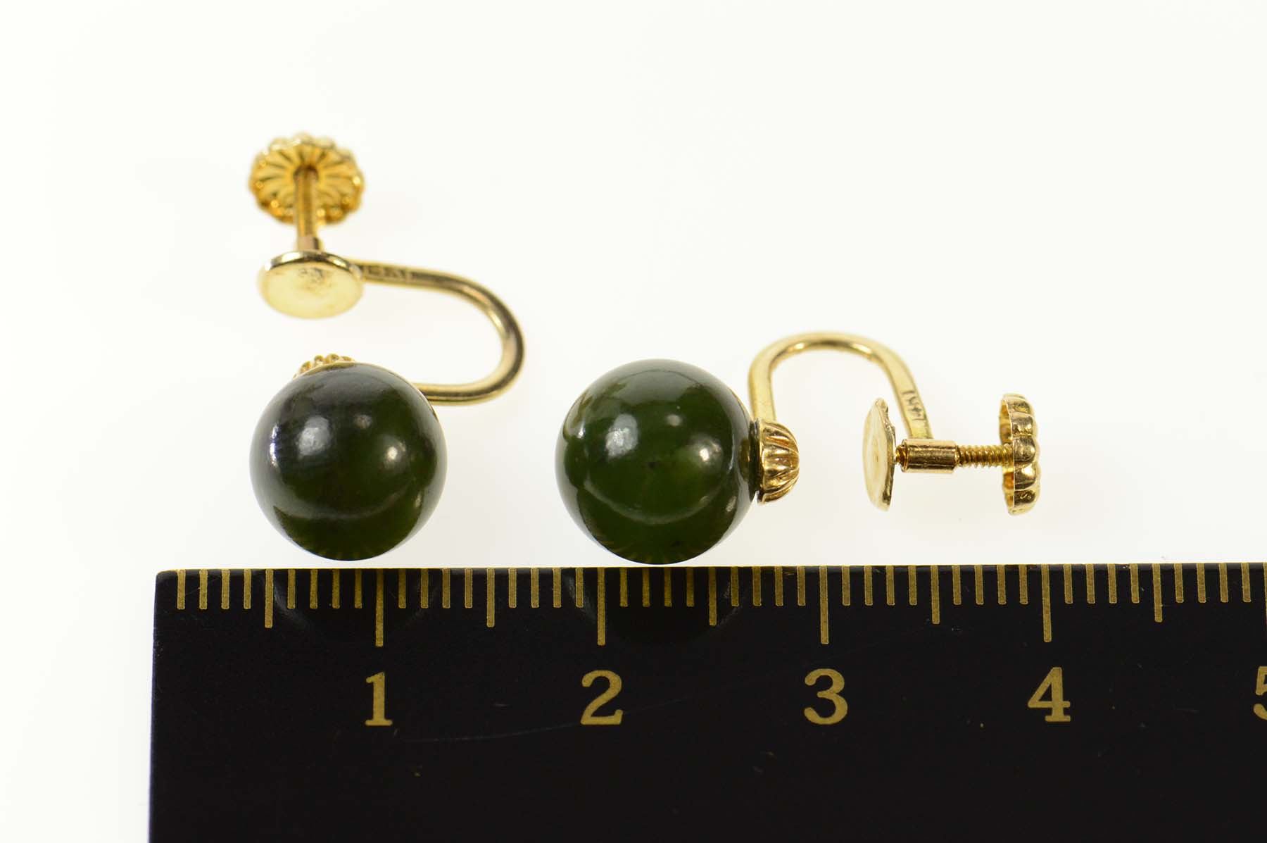 Item:  14K Retro 1960's Nephrite Sphere Screw Back Yellow Gold Earrings