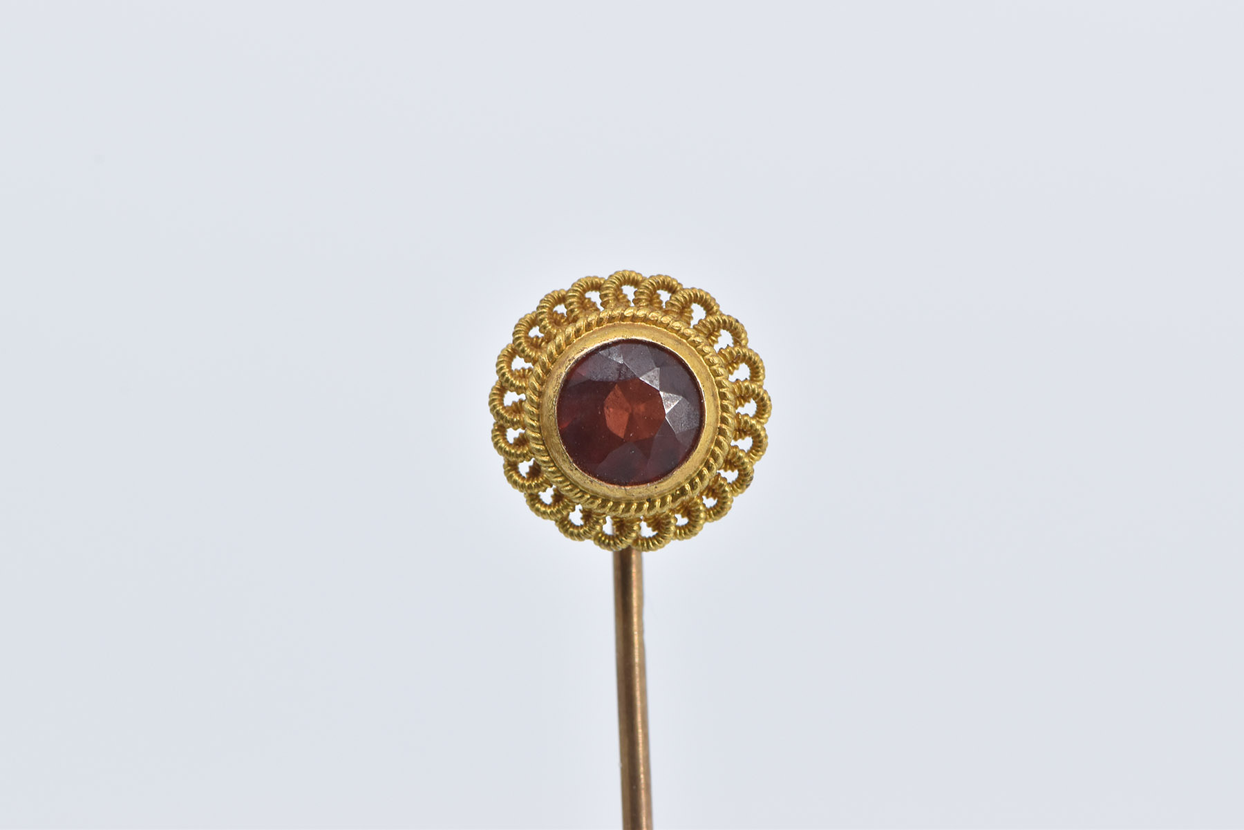 Item:  14K Round Garnet Swirl Filigree Ornate Yellow Gold Stick Pin