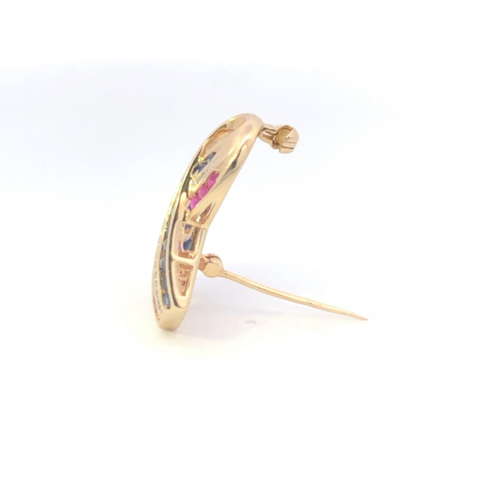 Item:  14K Ruby Sapphire Diamond Remembrance Ribbon Yellow Gold Pin/Brooch