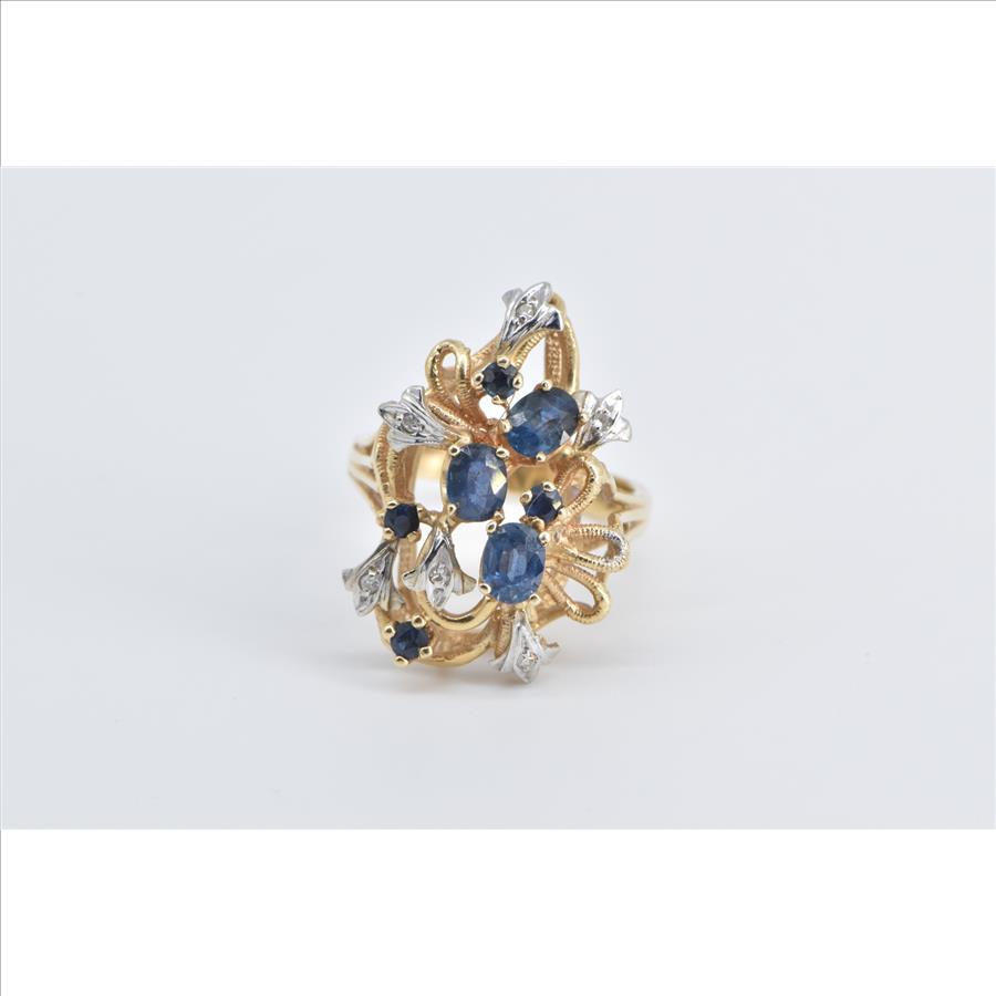 14K Sapphire Diamond Vintage Fashion Cluster Yellow Gold Ring, Size 7.5