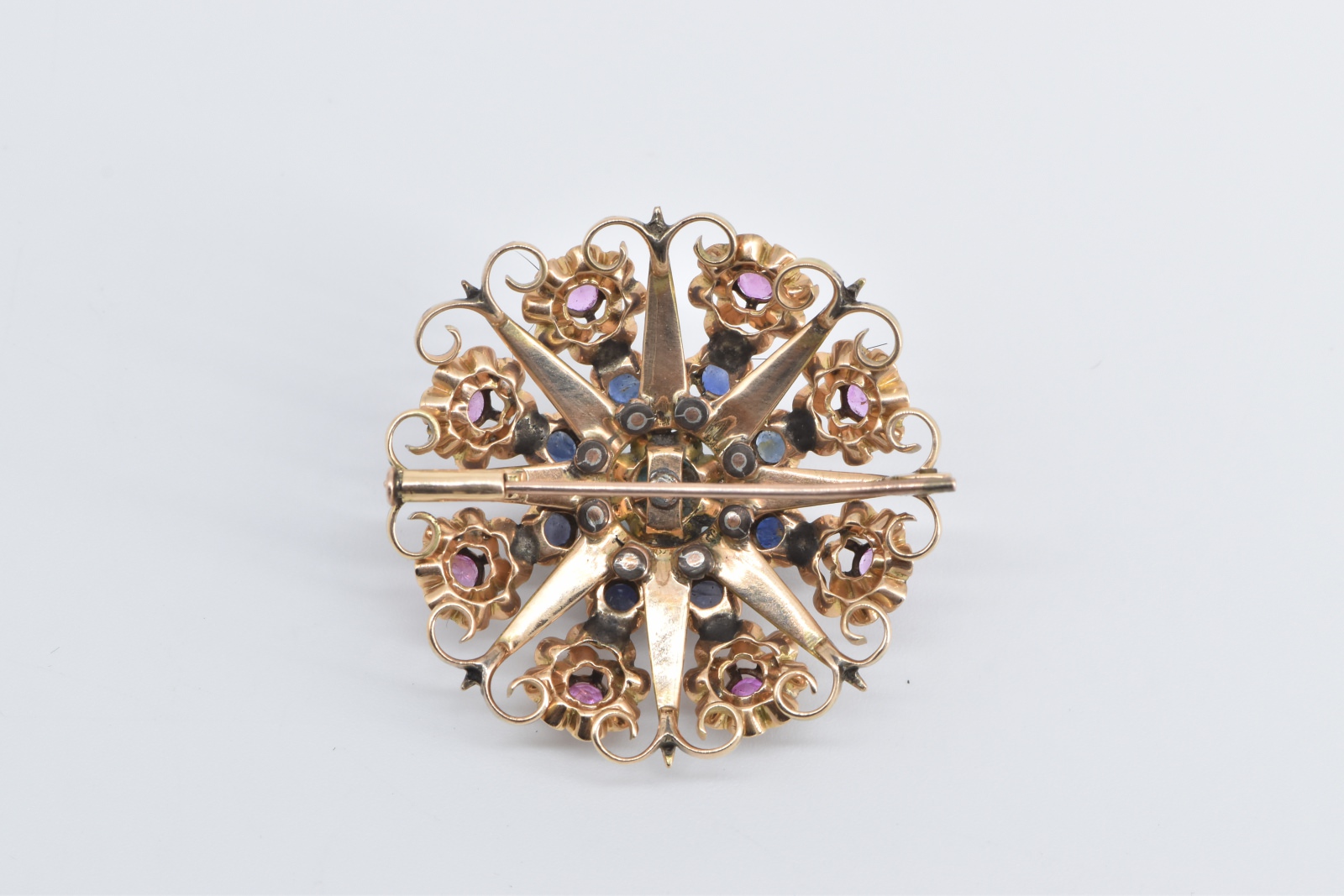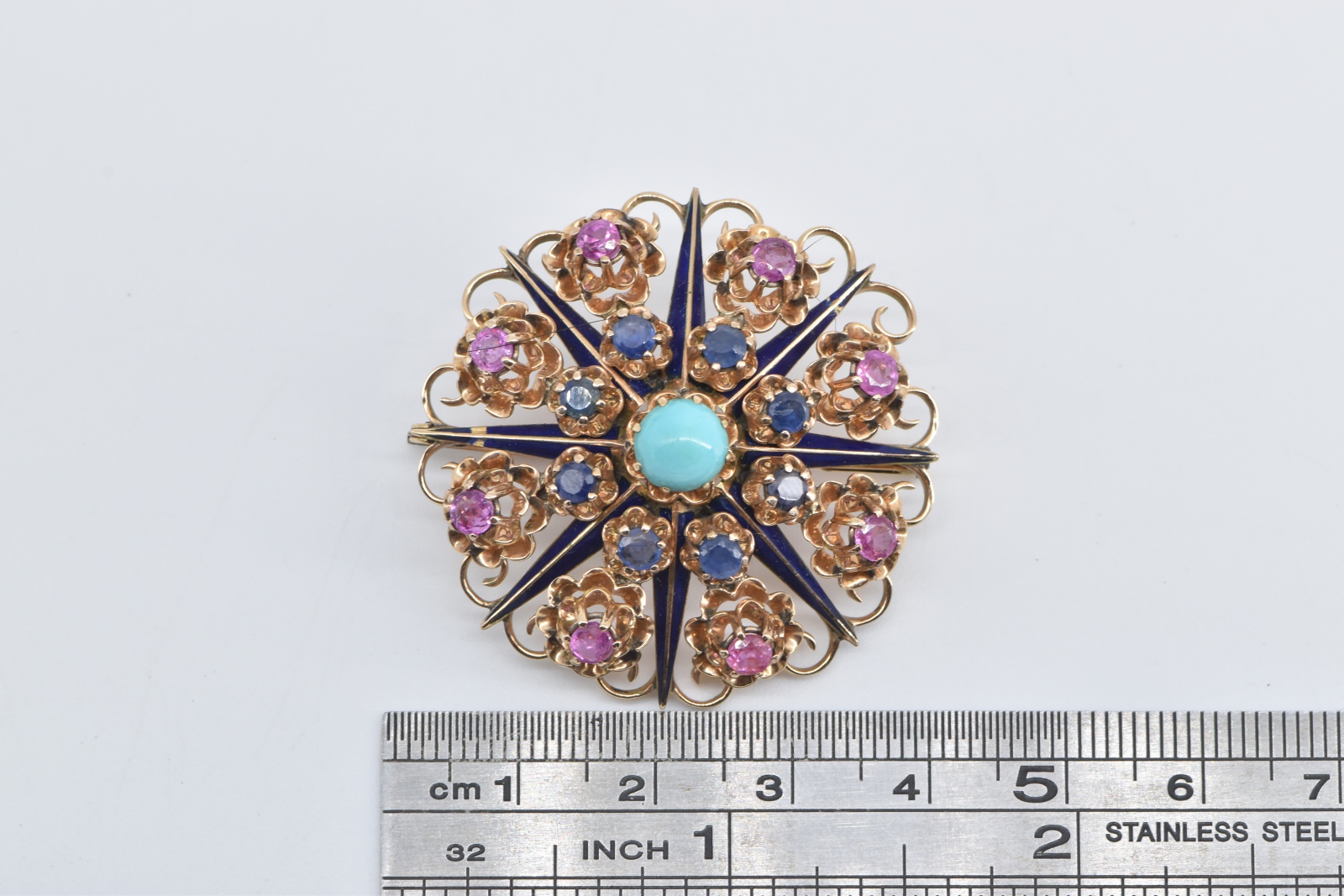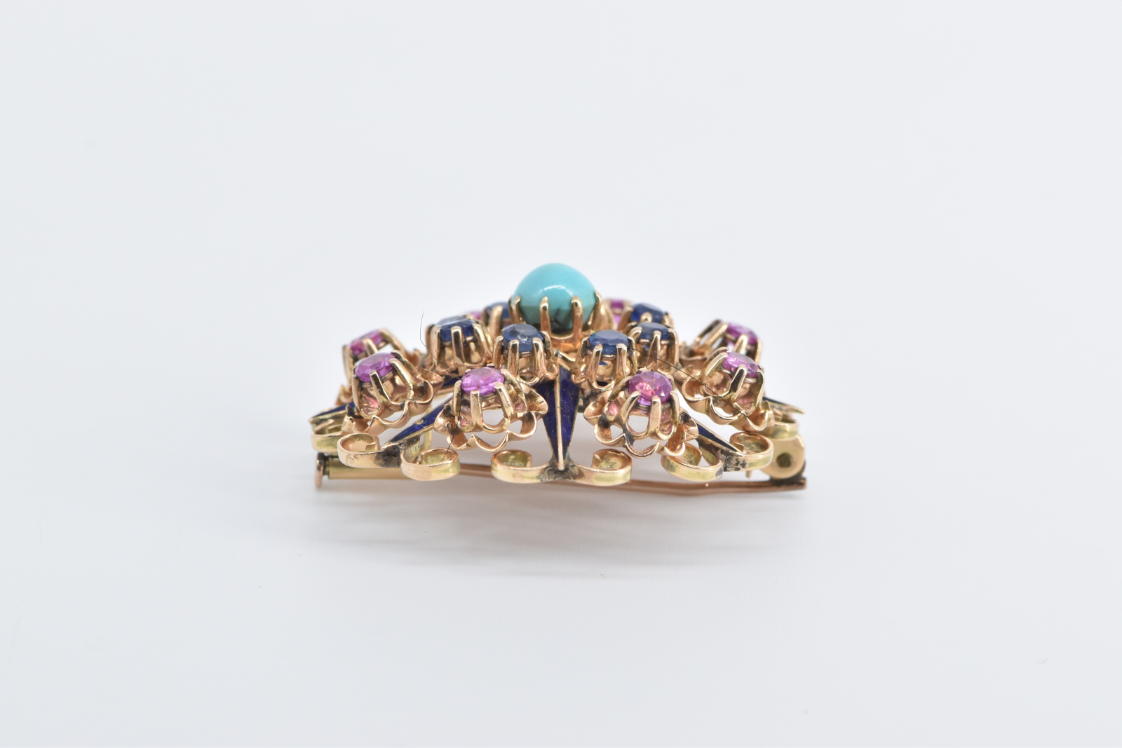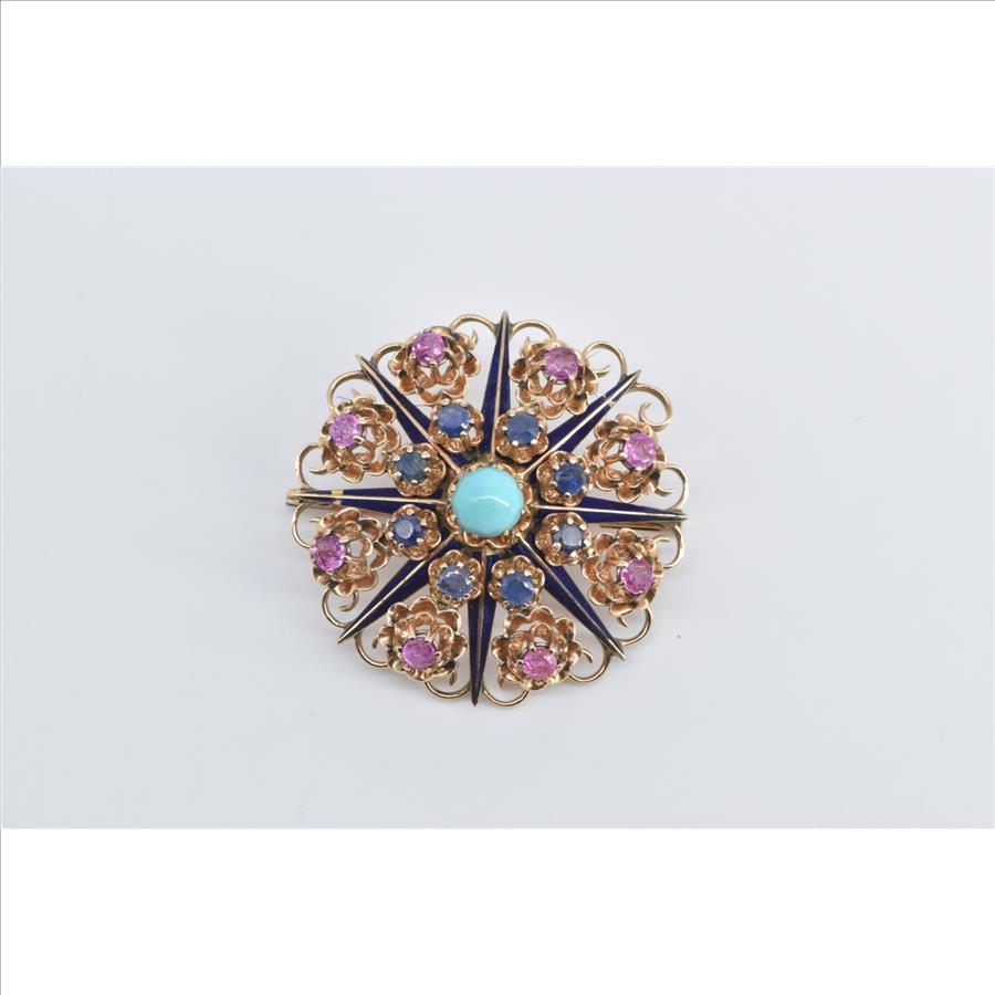 Item:  14K Turquoise Ruby Sapphire Ornate Domed Floral Yellow Gold Pendant/Pin