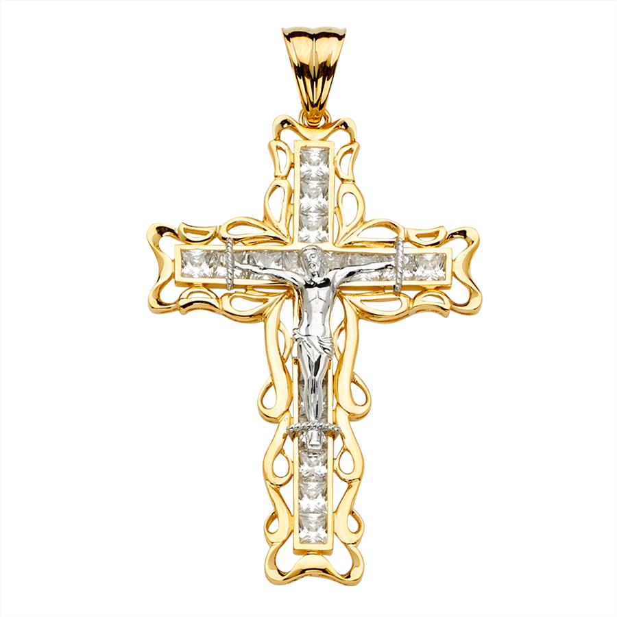 14K Two Tone Gold Cubic zirconia Crucufix Cross Pendant