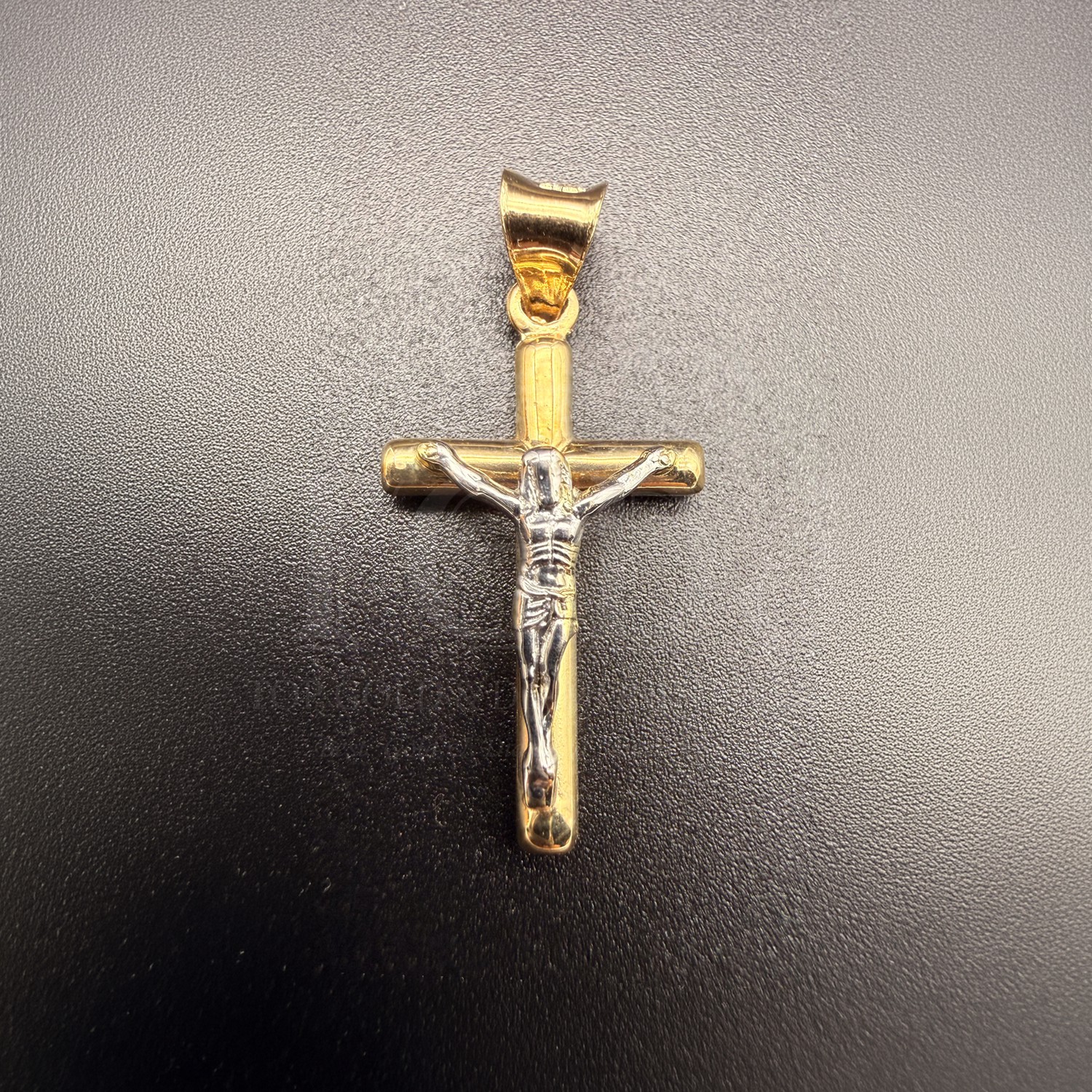 14K Two Tone Gold Hollow Round Tube Crucufix Pendant