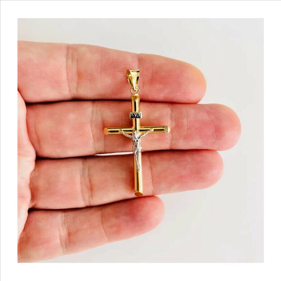 14K Two Tone Gold Hollow Round Tube Crucufix Pendant