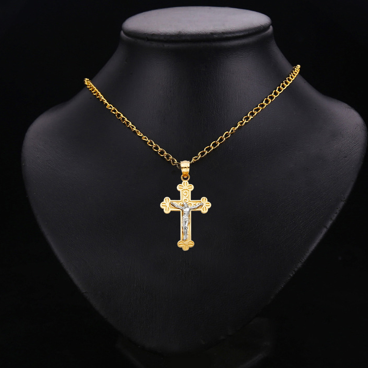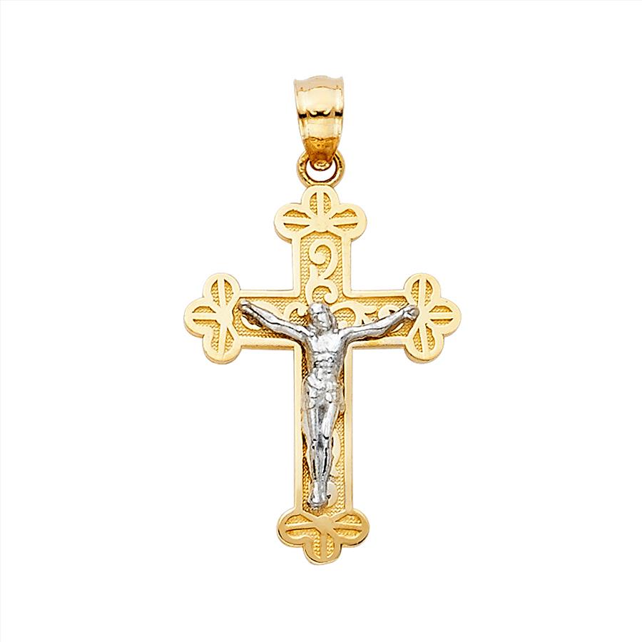 14K Two Tone White Yellow Gold Jesus Crucifix Cross Religious Pendant - 24 mm X 16 mm