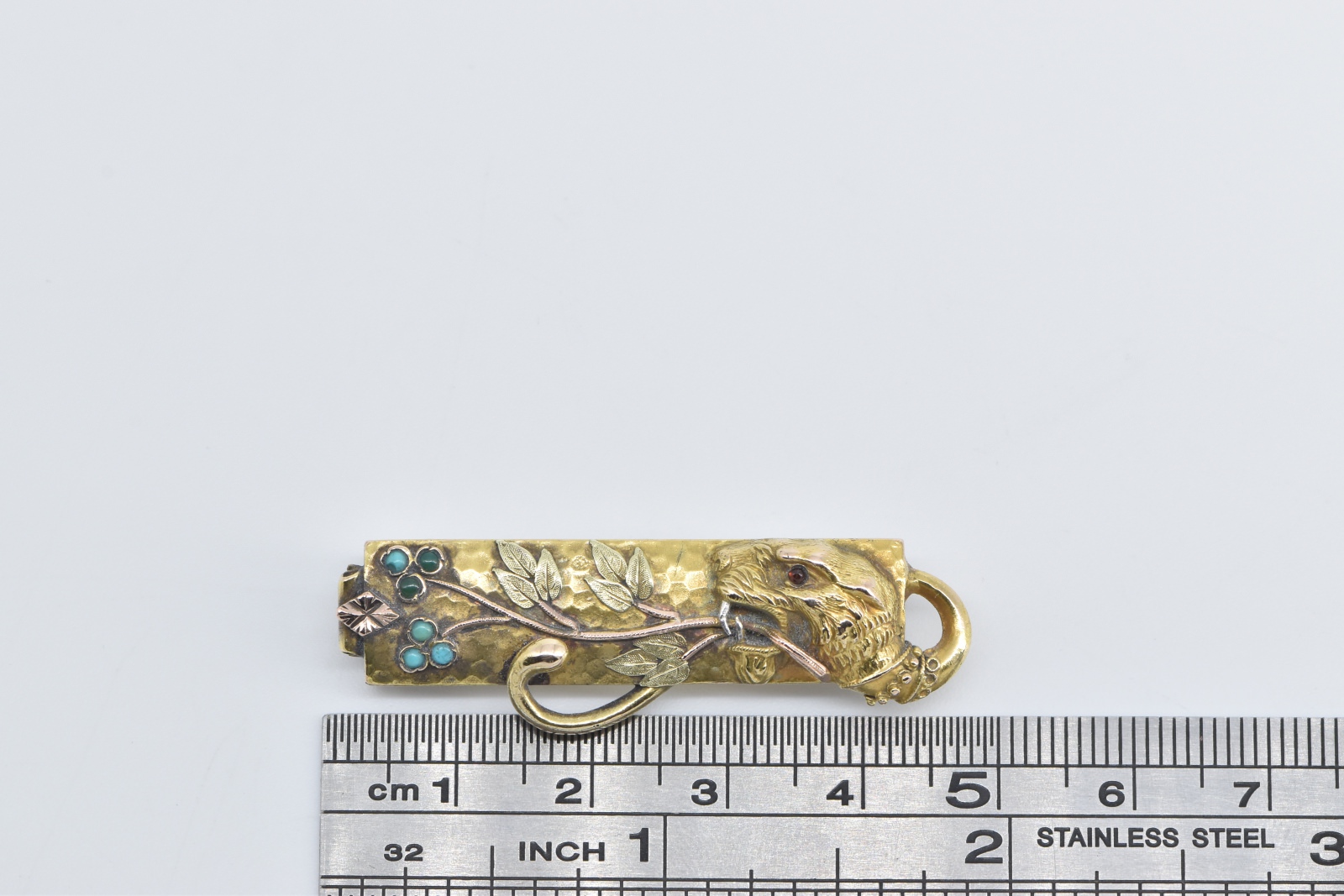14K Victorian Ornate Tiger Turquoise Floral Branch Yellow Gold Pin/Brooch