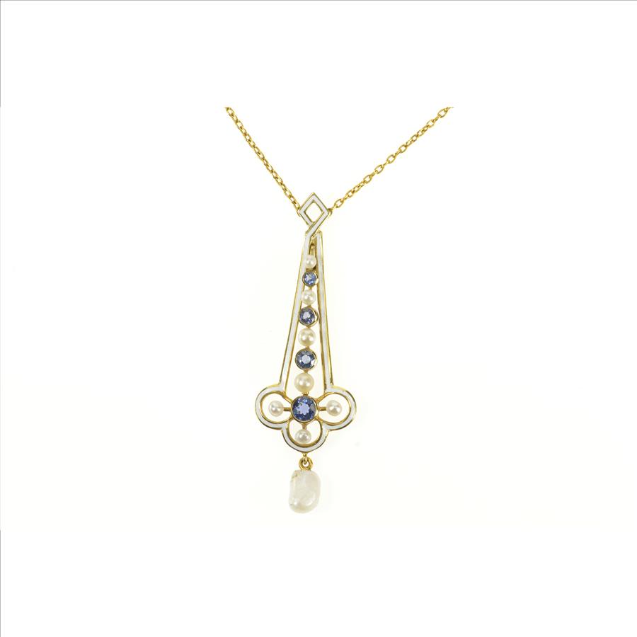 Item:  14K Victorian Sapphire Pearl Enamel Drop Yellow Gold Necklace 16.5"