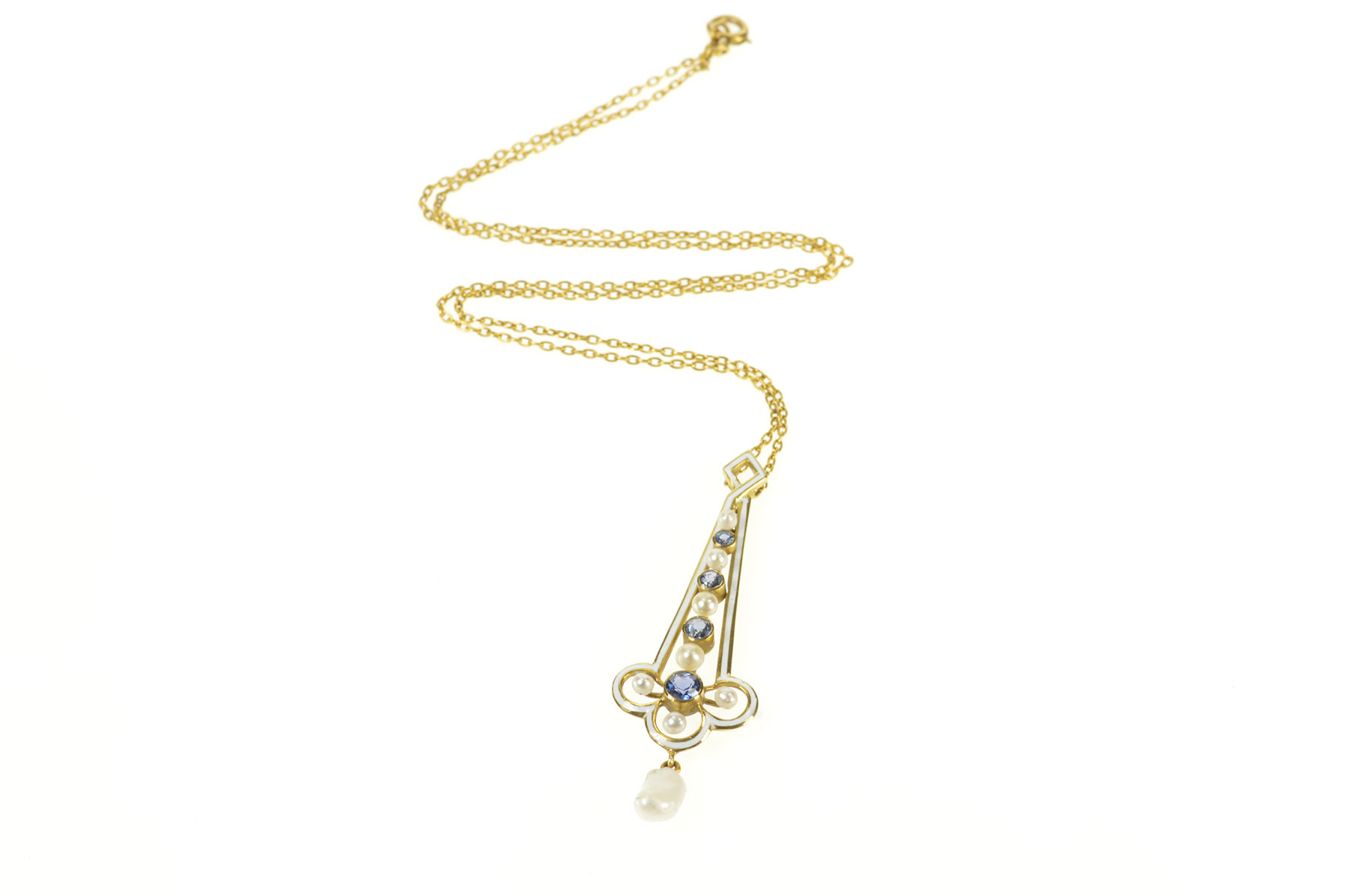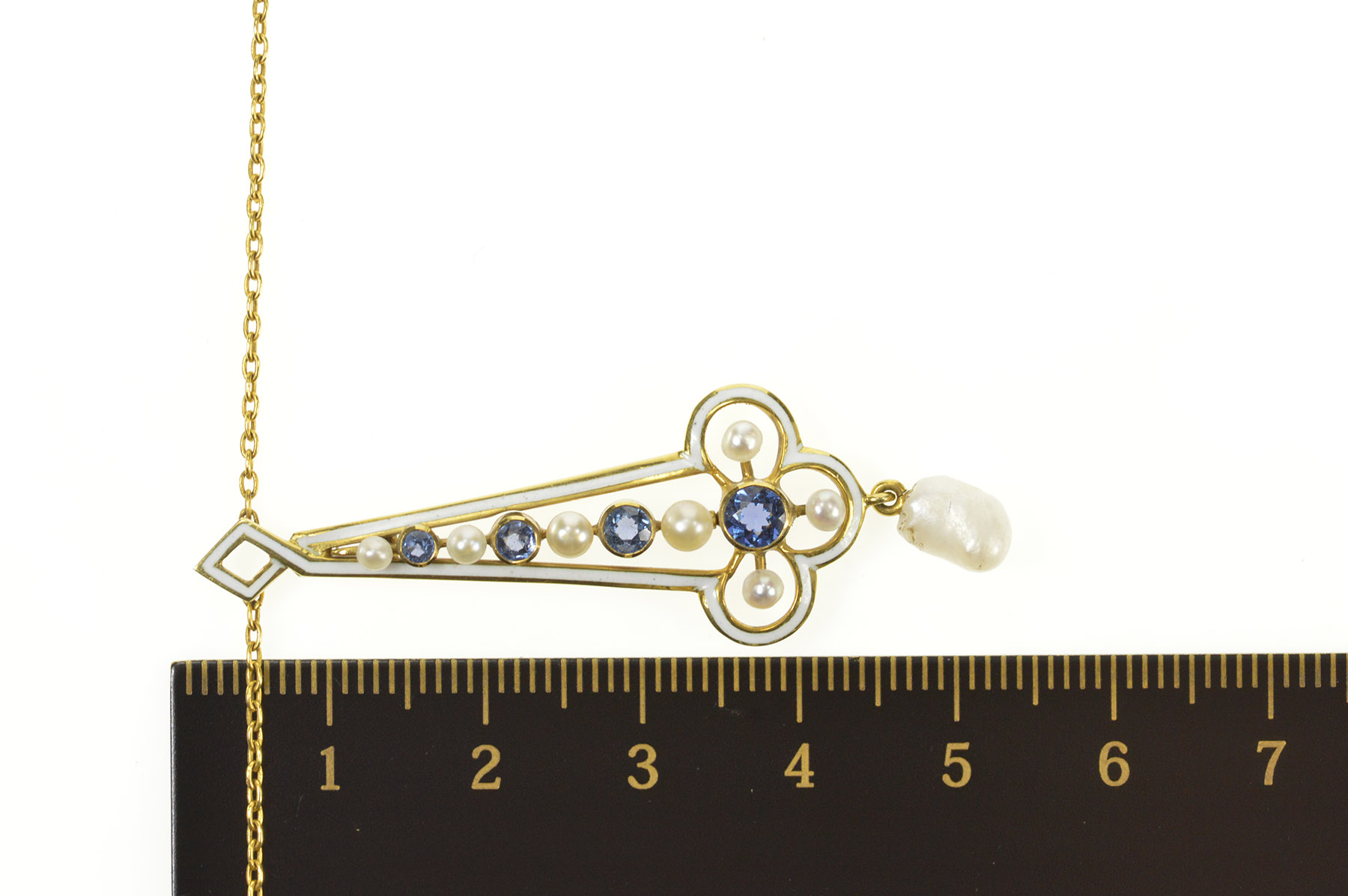 14K Victorian Sapphire Pearl Enamel Drop Yellow Gold Necklace 16.5"