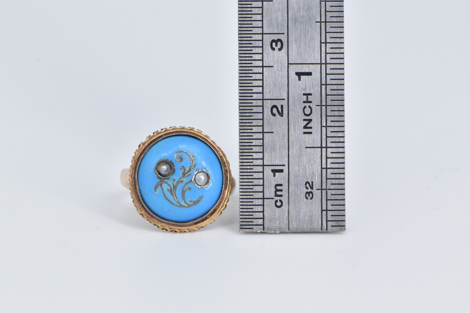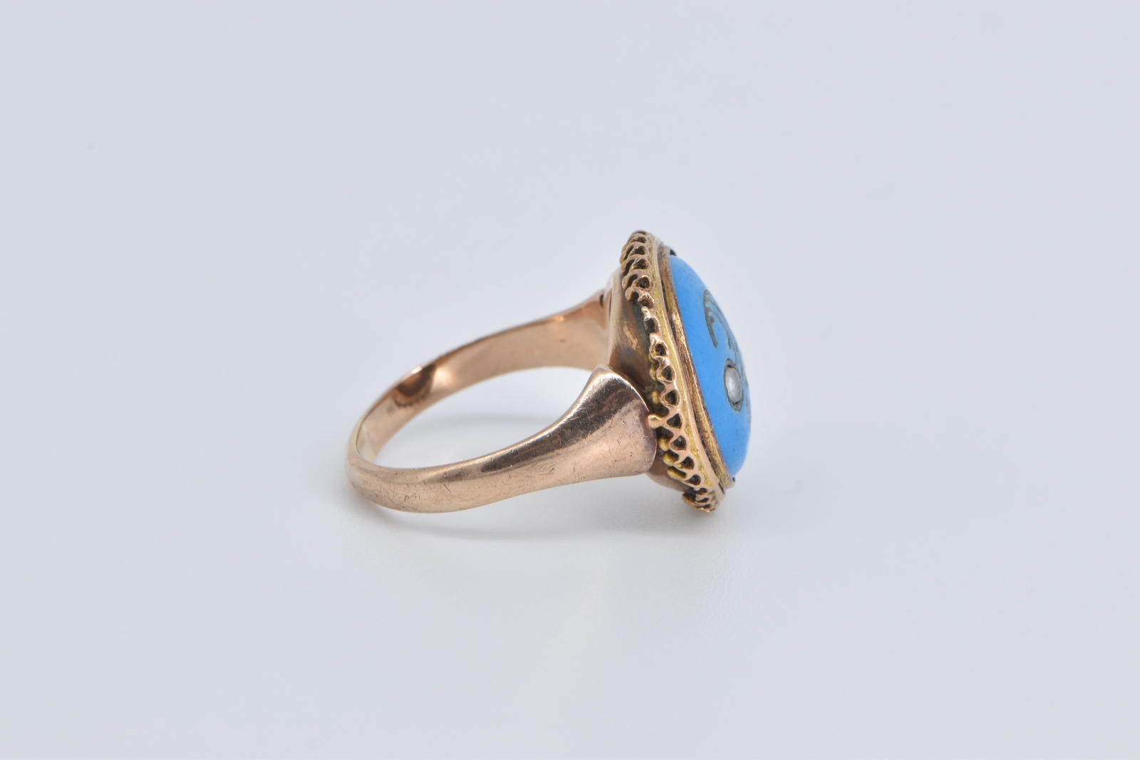 Item:  14K Victorian Turquoise Seed Pearl Swirl Statement Rose Gold Ring, Size 5.5