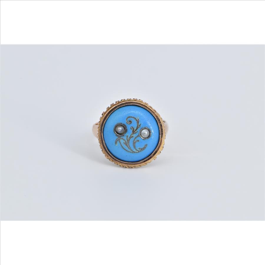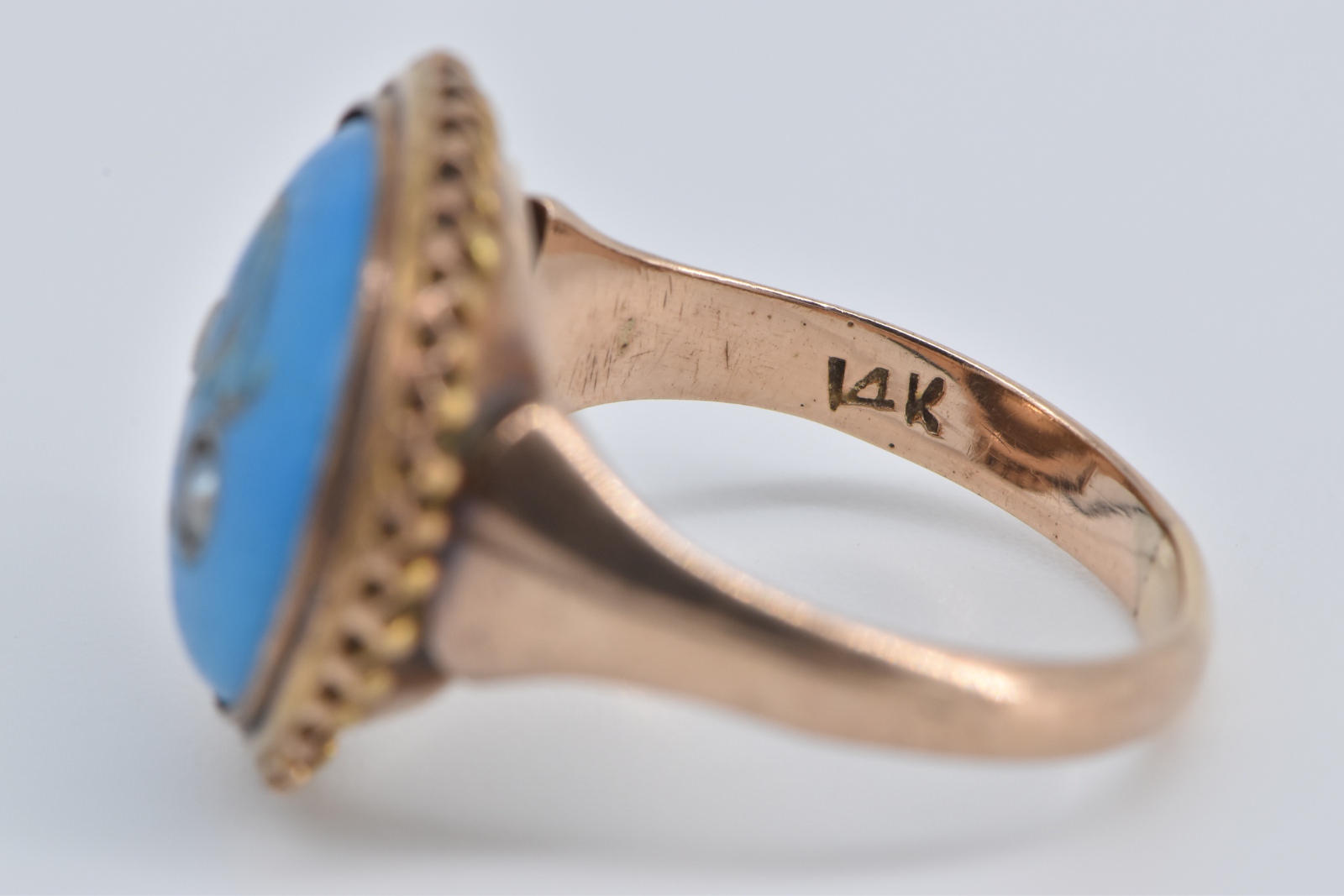 Item:  14K Victorian Turquoise Seed Pearl Swirl Statement Rose Gold Ring, Size 5.5