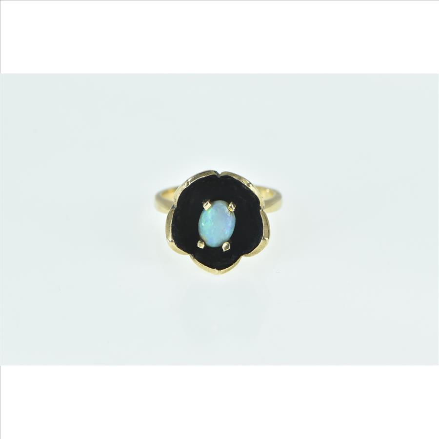 14K Vintage Natural Opal Ornate Tulip Flower Yellow Gold Ring, Size 5.75