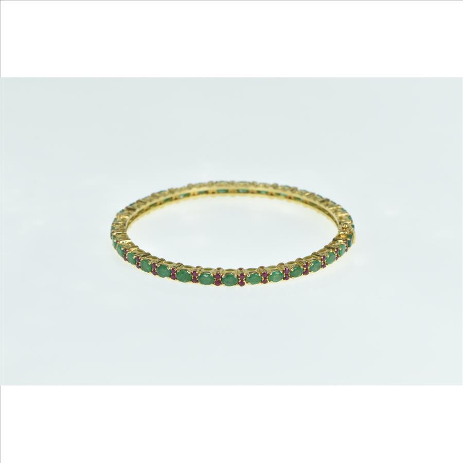 Item:  14K Vintage Ruby Emerald Encrusted Bangle Yellow Gold Bracelet 7"
