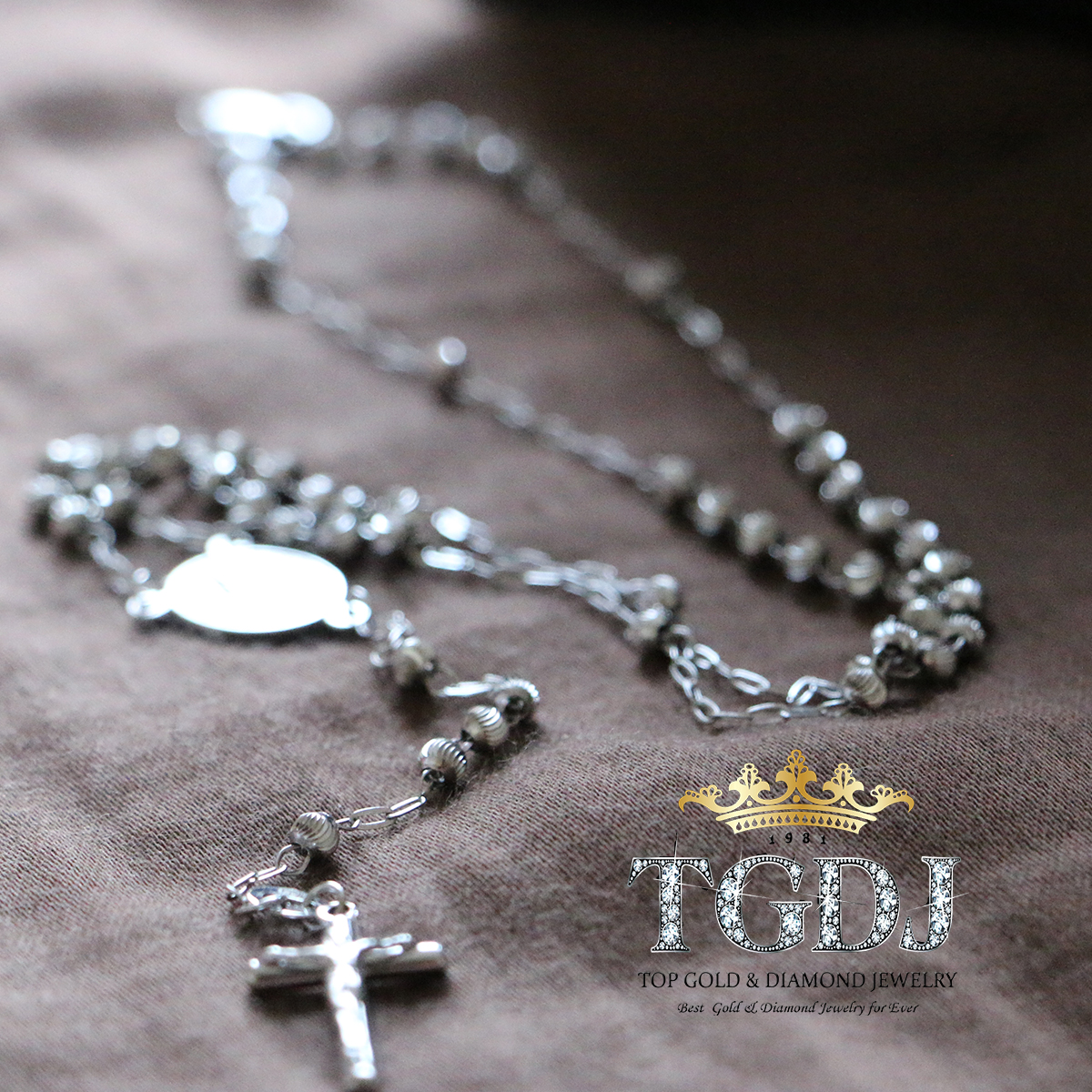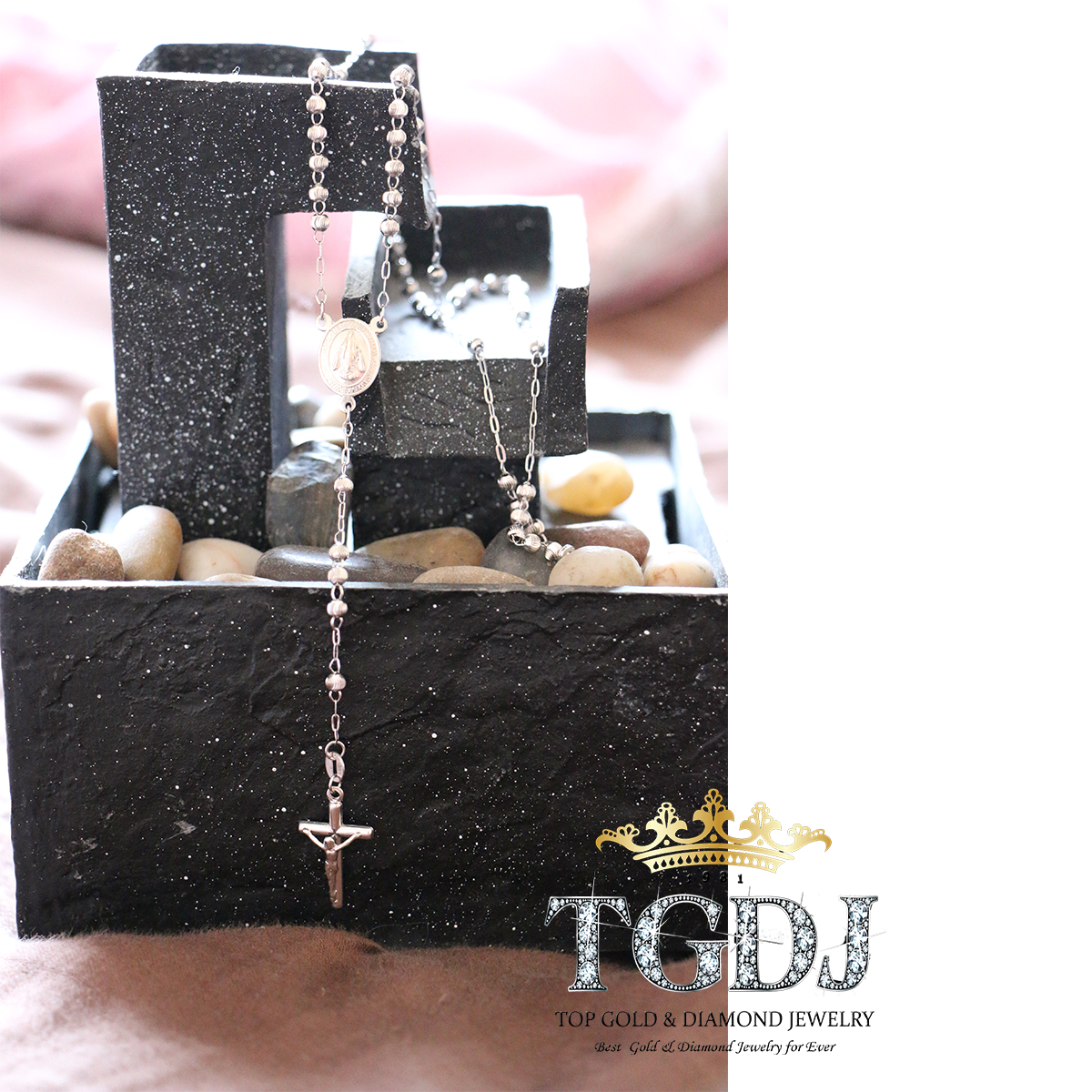 14K White Gold 3mm Moon Ball Rosary Necklace - 18"