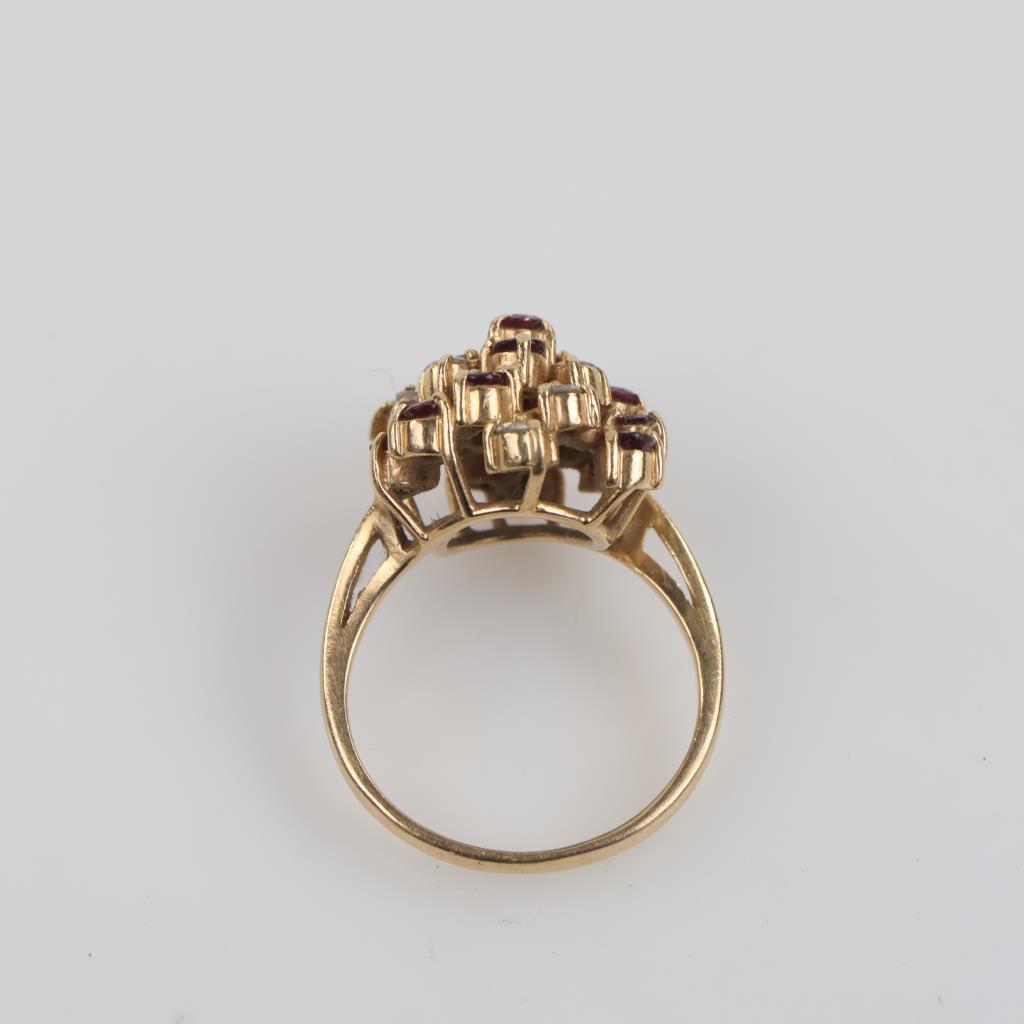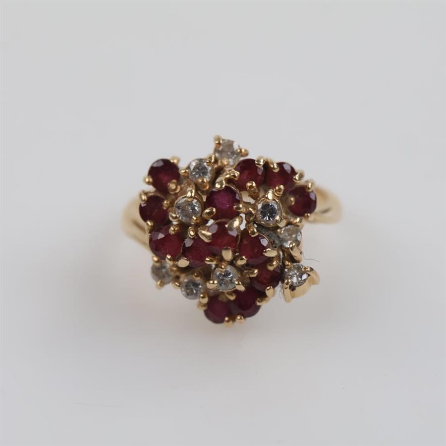 14kt Gold Red Stone Diamond Cluster Ring
