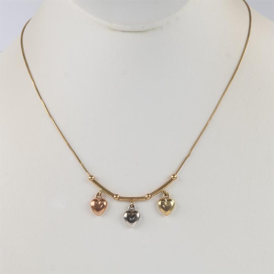 14kt Tri-Color Gold Hollow Heart Charm And Bead Necklace