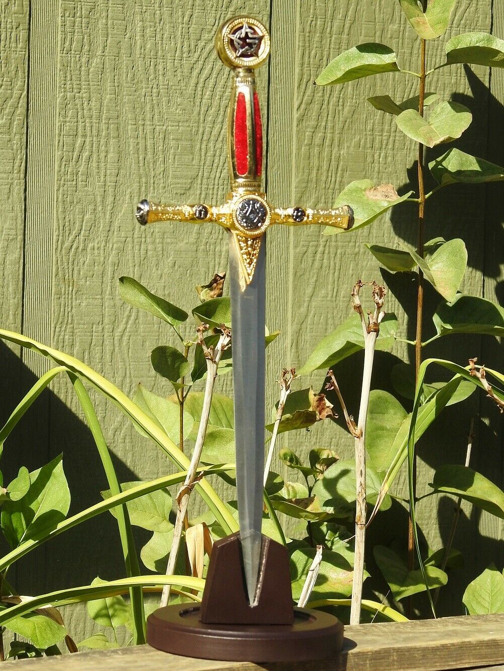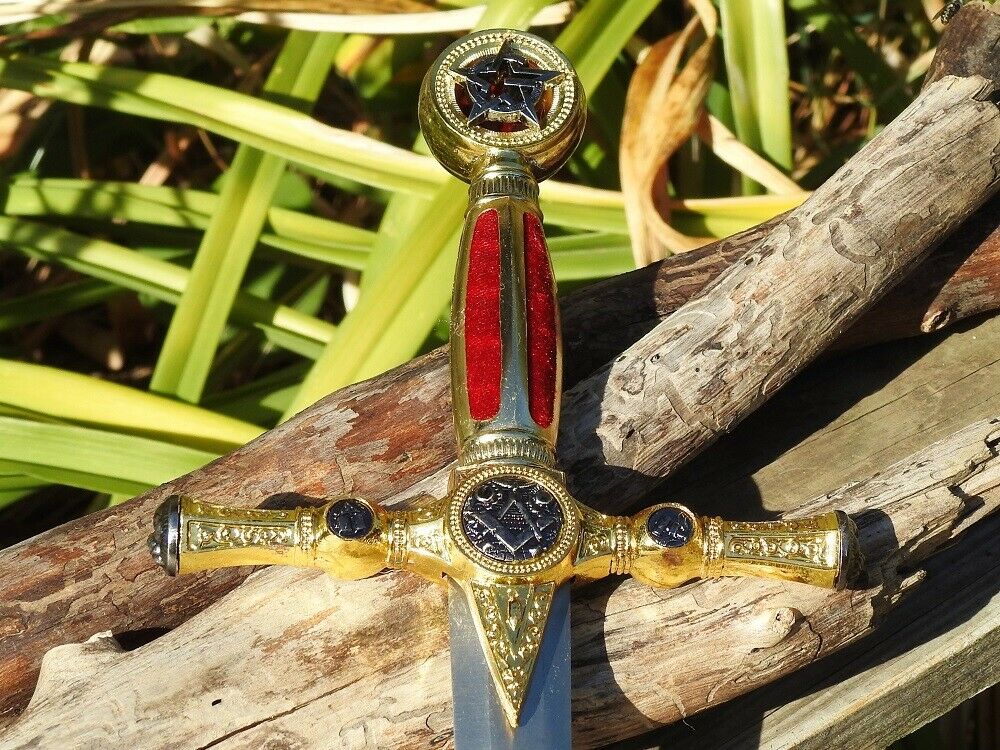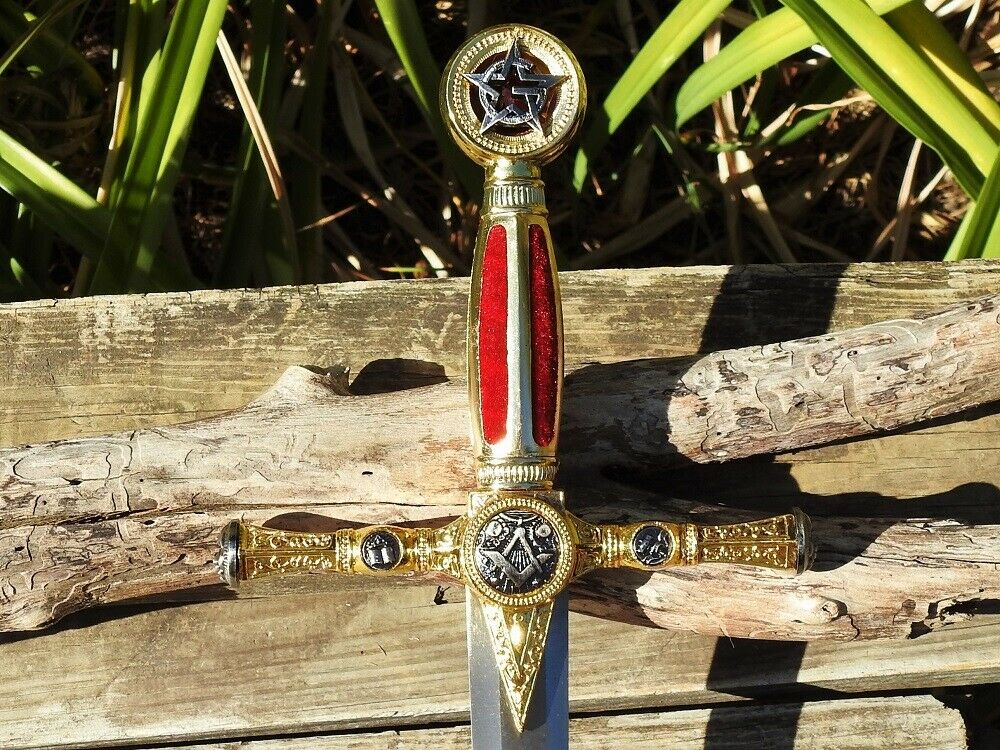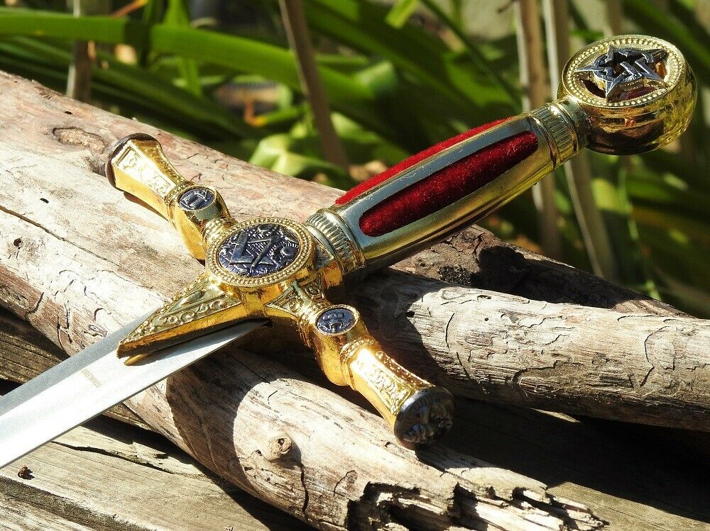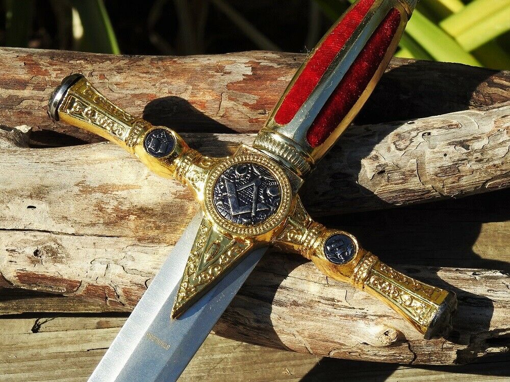 This impressive dagger features a gold color toned hilt that is rich in design, possessing fine details that all link back to Masonic tradition, the Square and Compasses, Hammer, All Seeing Eye, Order of the Eastern Star and faces while the handle has a red velvet like grip