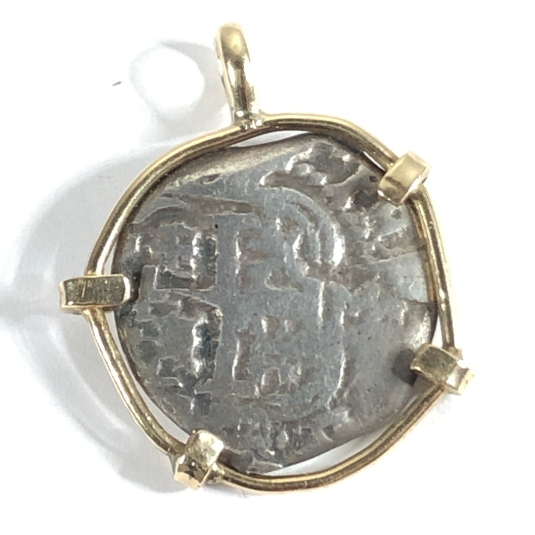 1730 Spanish Silver 2 Reale Cob Coin in 14K Gold Bezel*6.7 Grams Total Weight