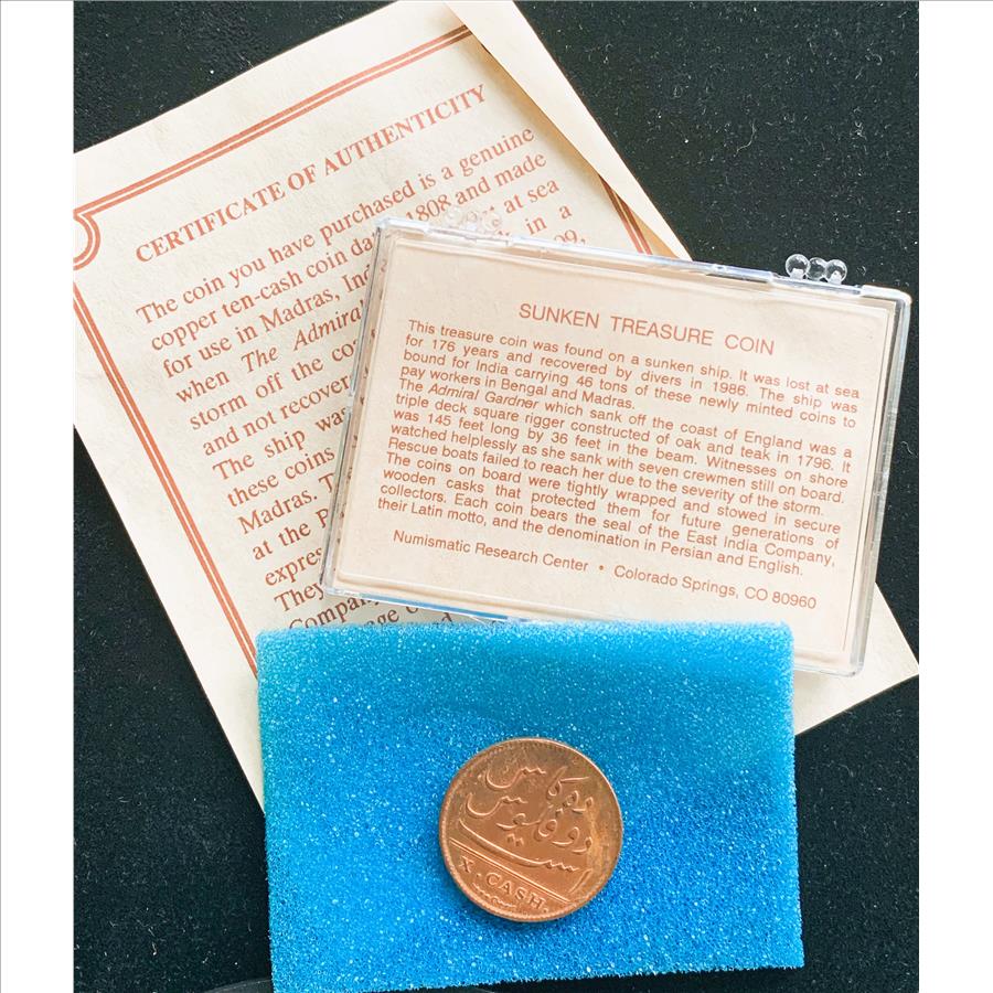 1808 INDIA COIN FROM SUNKEN TREASURE FROM THE ADMIRAL GARDNER SHIP SUNK IN 1809, IN CASE WITH COA