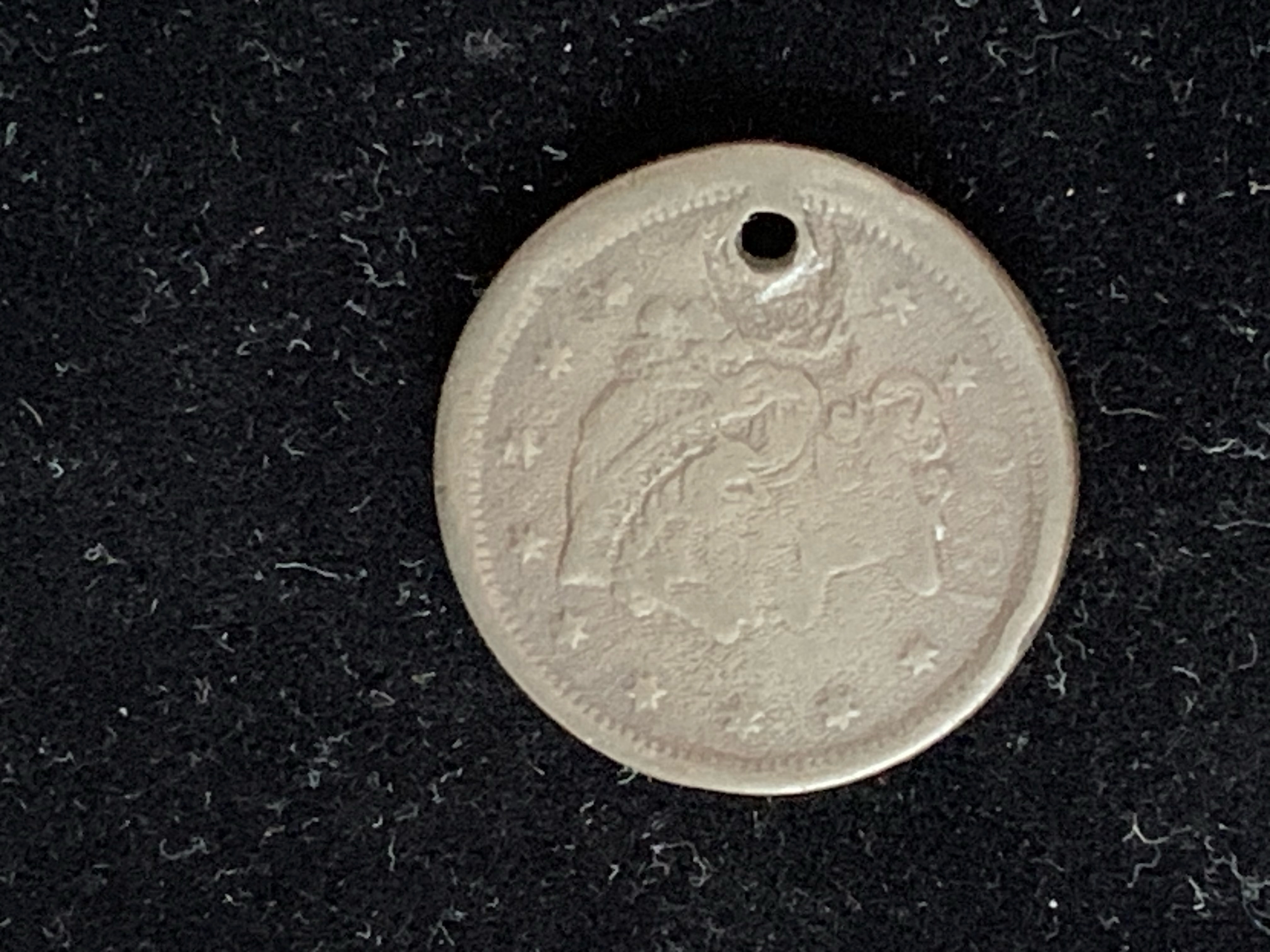 1850 US ONE CENT, WITH NECKLACE HOLE SOMETIMES WORN BY CIVIL WAR SOLDIERS. LOTS OF DETAIL ON THIS OLD COIN