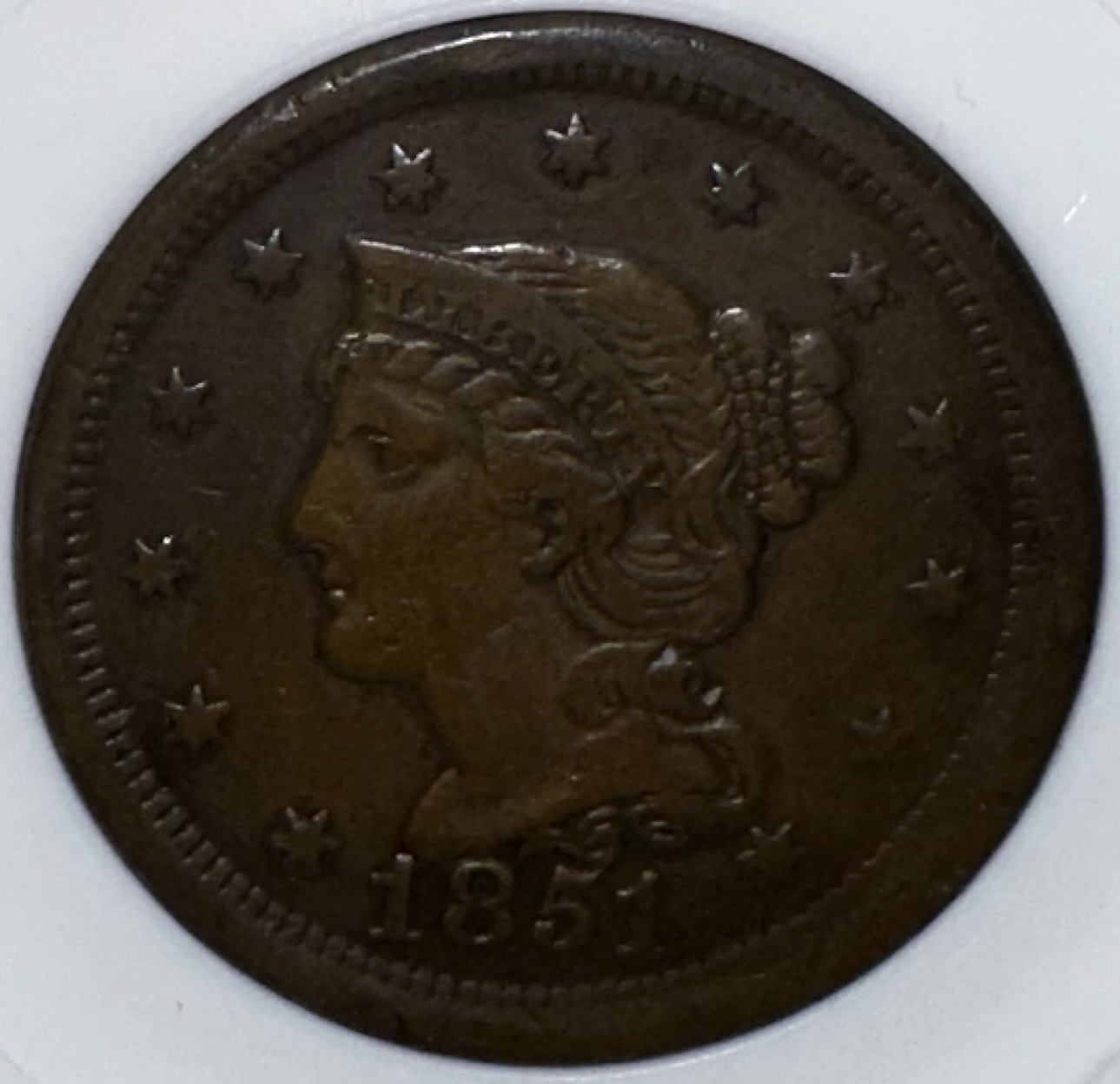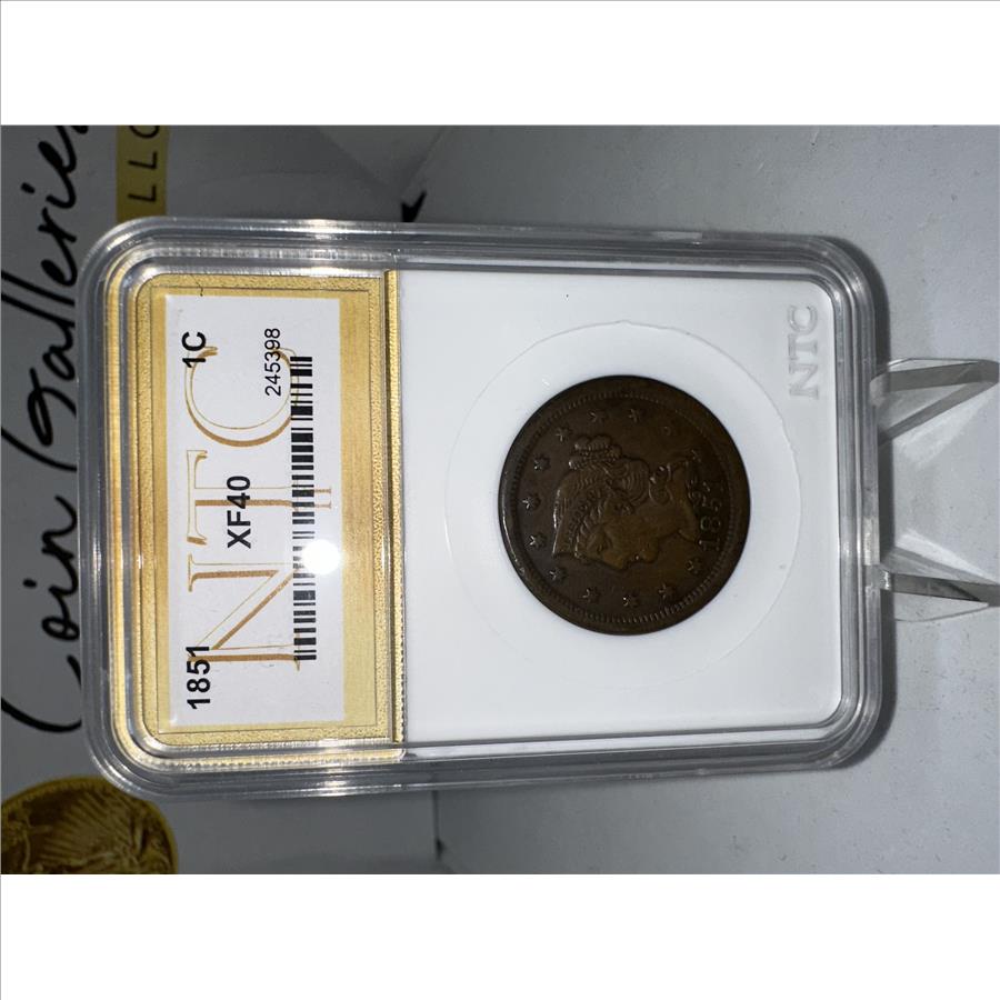 1851 US Large Cent XF-40 NTC II Certified. The coin pictured is the coin you will receive.