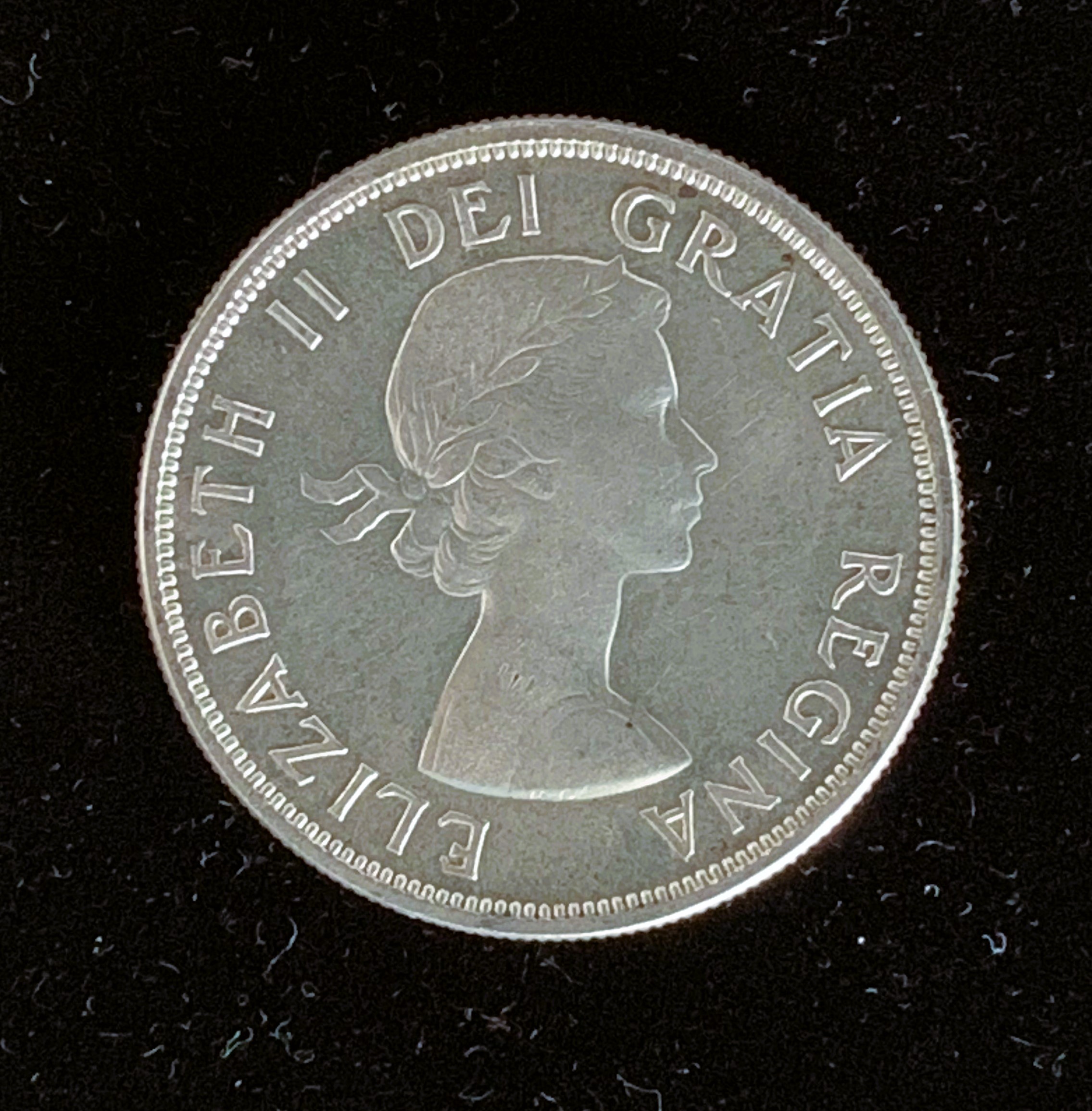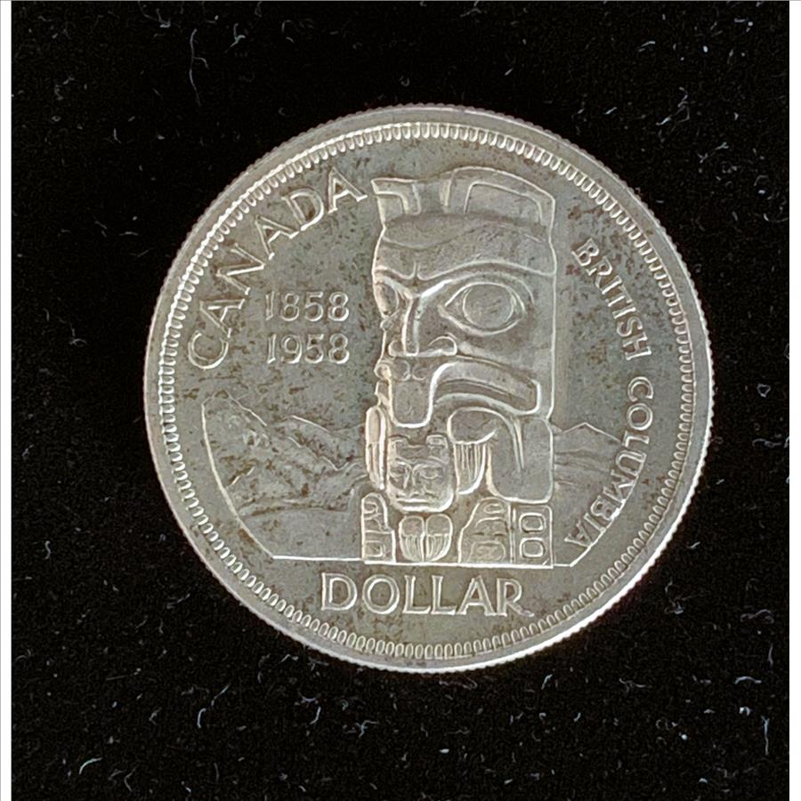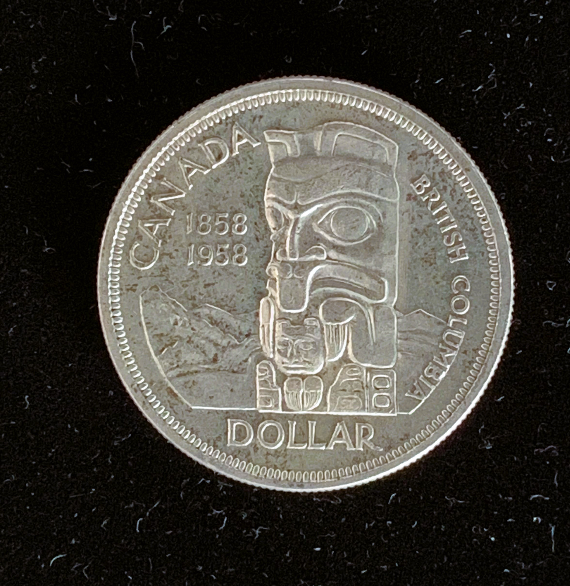 1858-1958 SILVER CANADIAN DOLLAR COIN, BRITISH COLUMBIA TOTEM POLE, UNC NICE