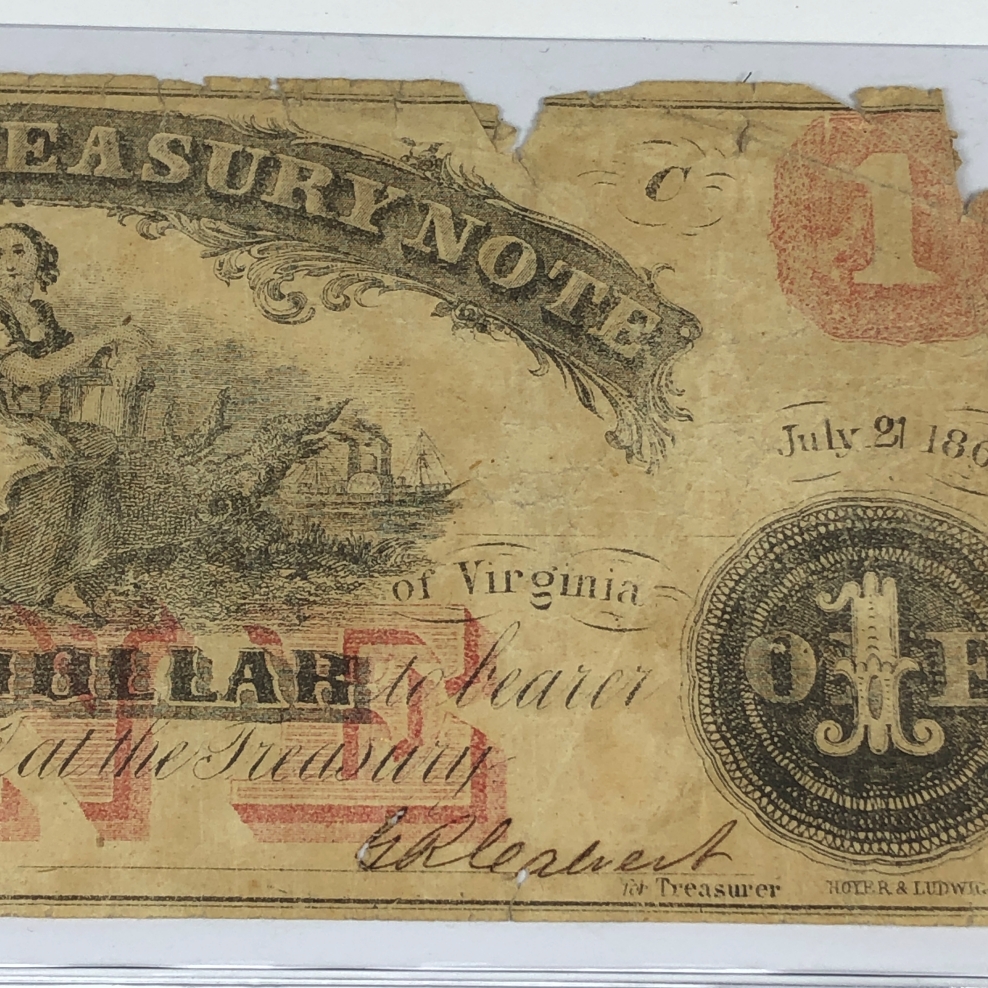 1862 $1 Virginia Treasury Note*Obsolete Currency From Richmond