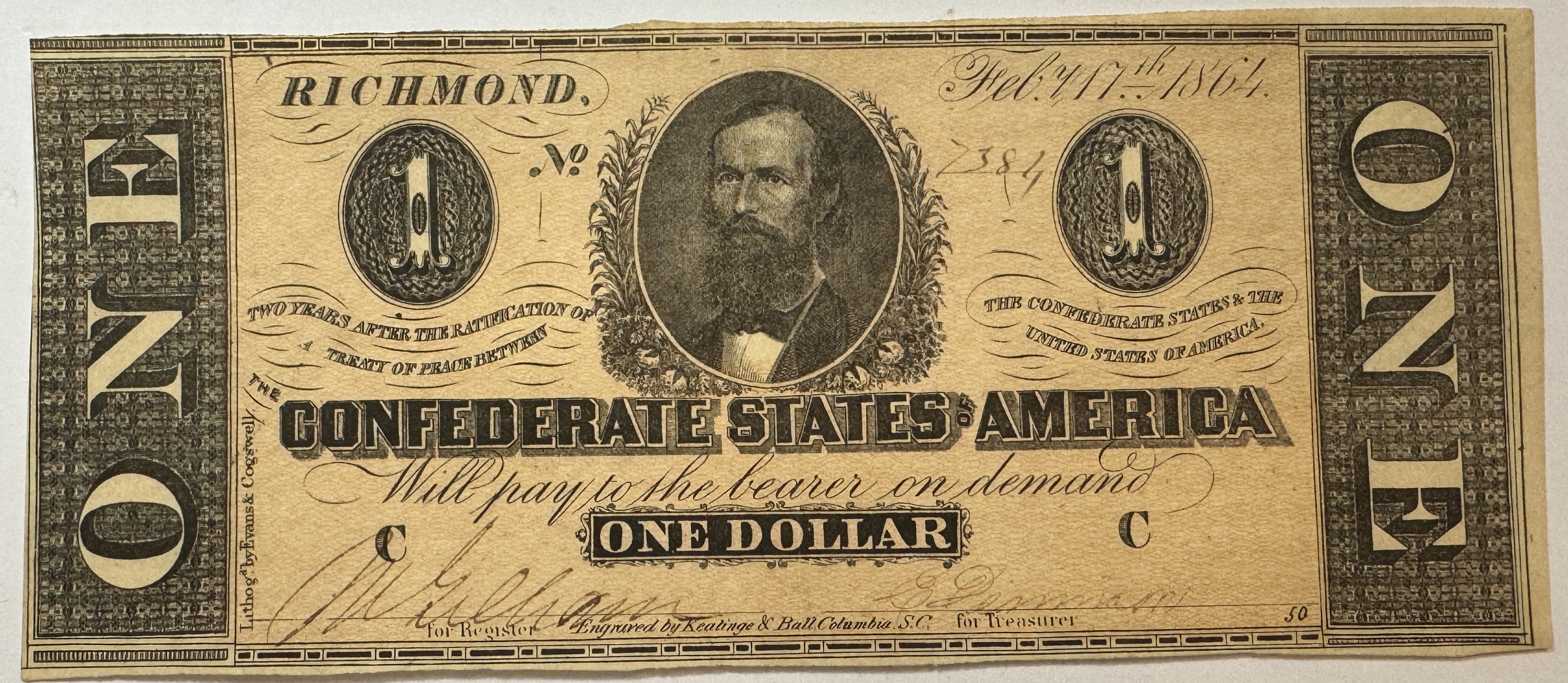 1864 $1 Confederate States of America Note - HIGH GRADE