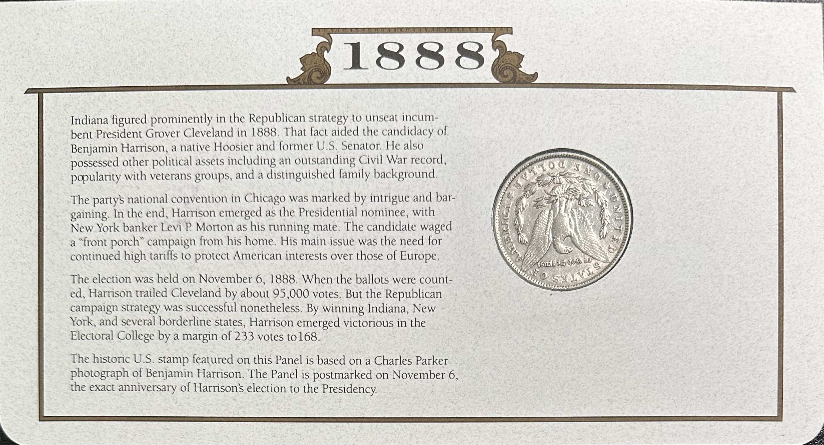 >1888 U.S. Silver Morgan Dollar - The U.S. Silver Dollar Collection With Stamp Honoring Elected President Benjamin Harrison!