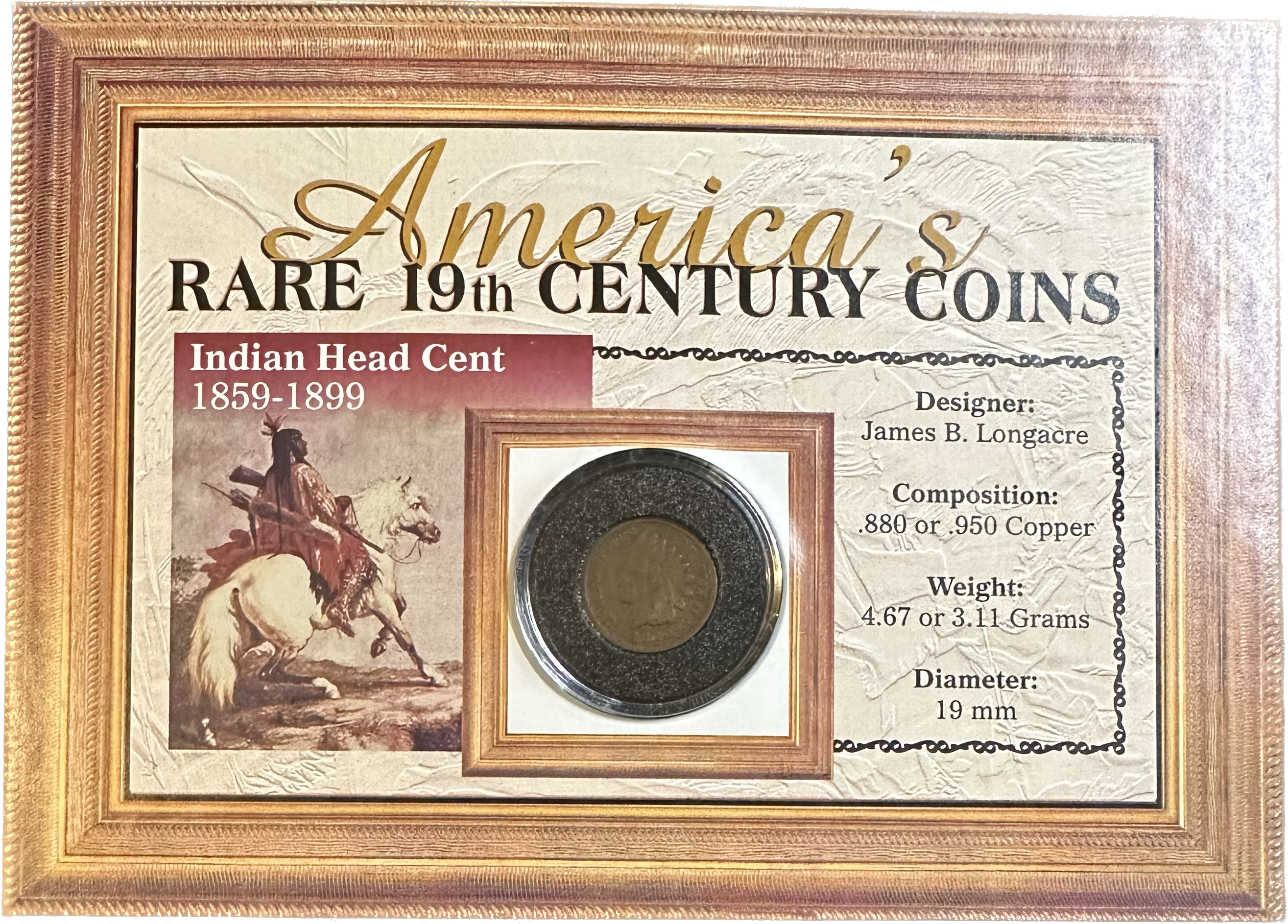 >1890 U.S. Indian Head One Cent - America's Rare 19th Century Coins - In Custom Display Panel