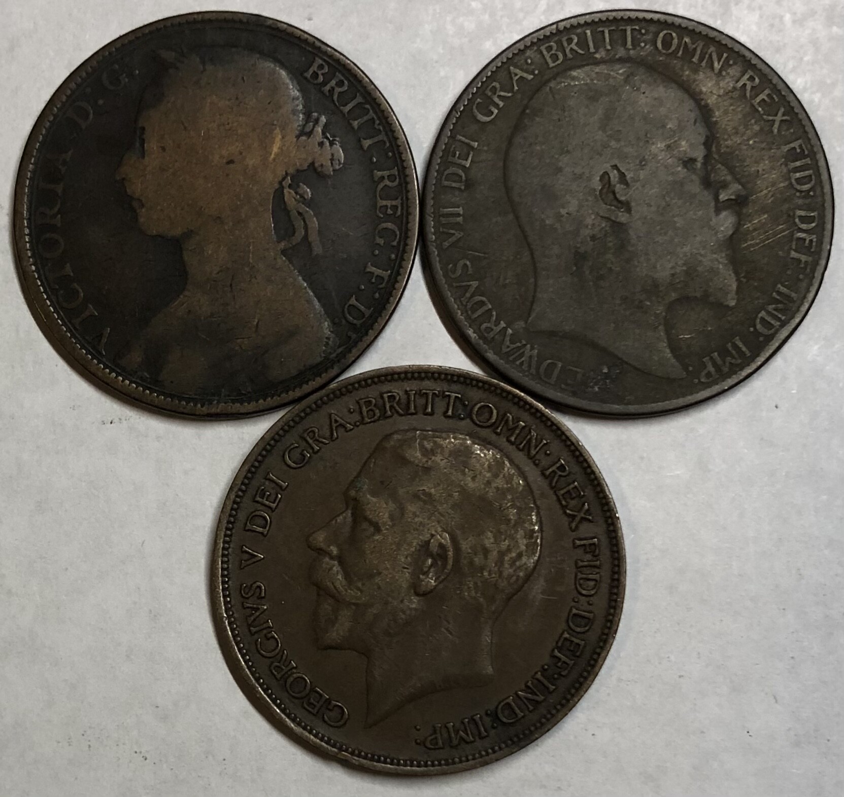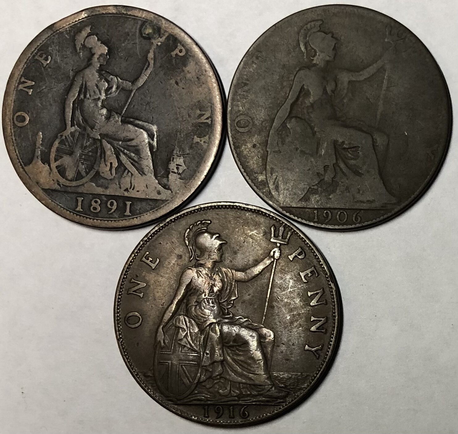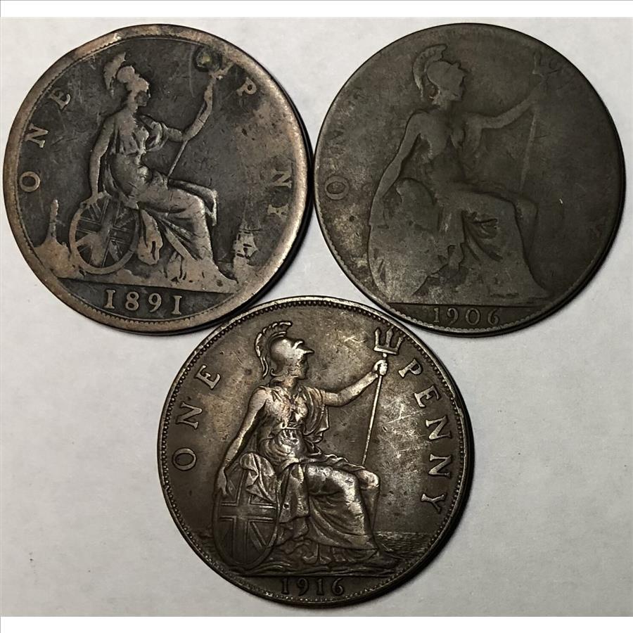 >1891, 1906 & 1916 Great Britain One Penny - 3 Coins