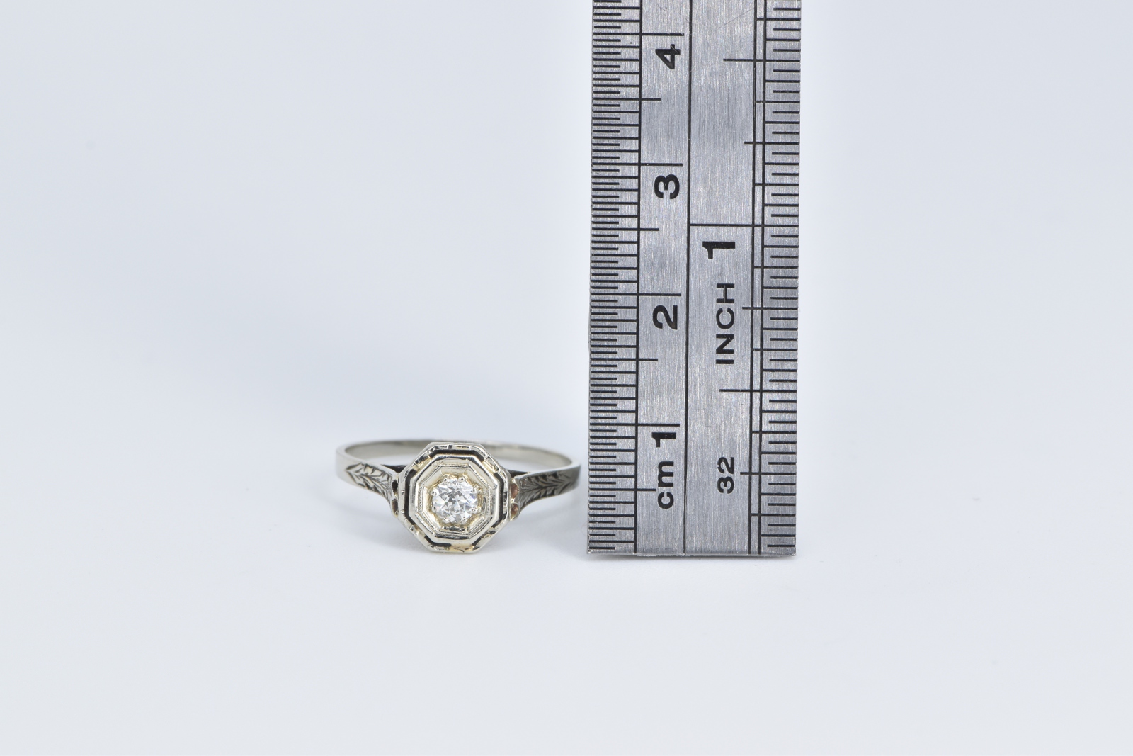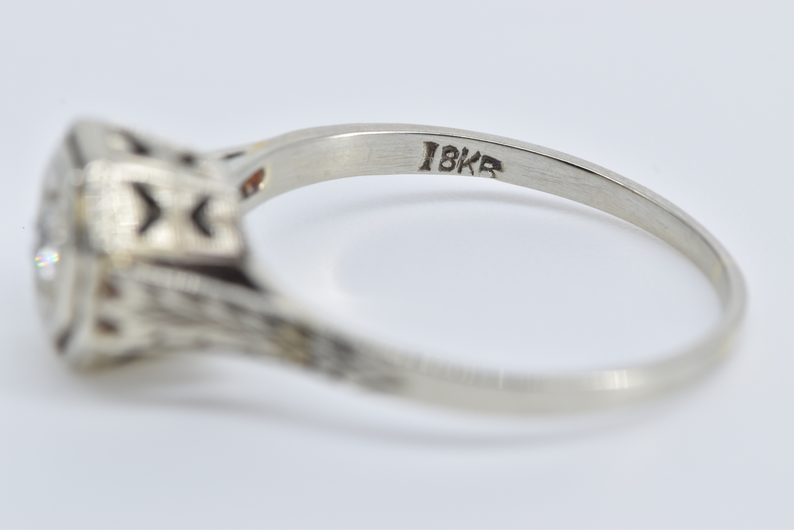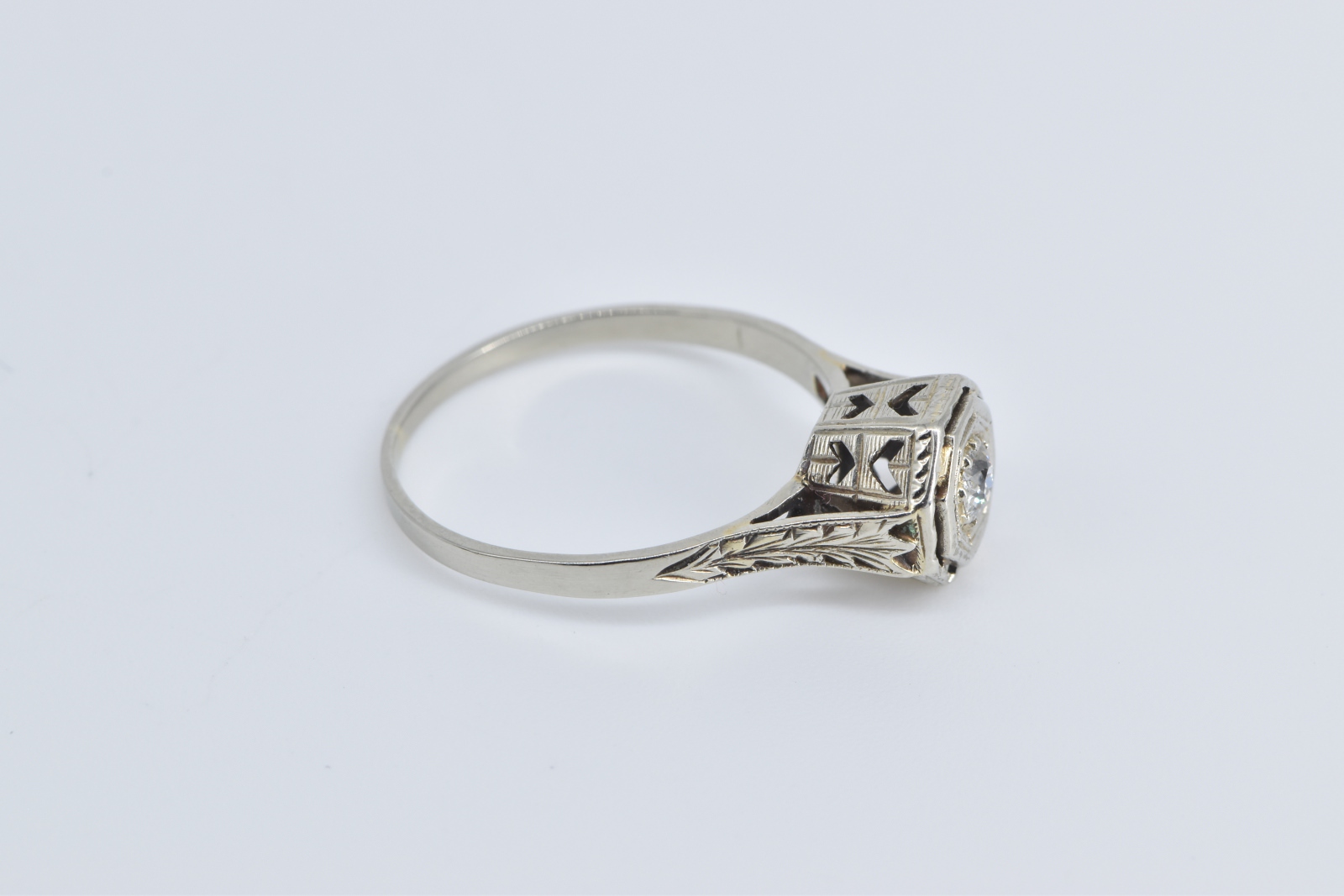 Item:  18K 0.18 Ct Diamond Art Deco Filigree Engagement White Gold Ring, Size 8