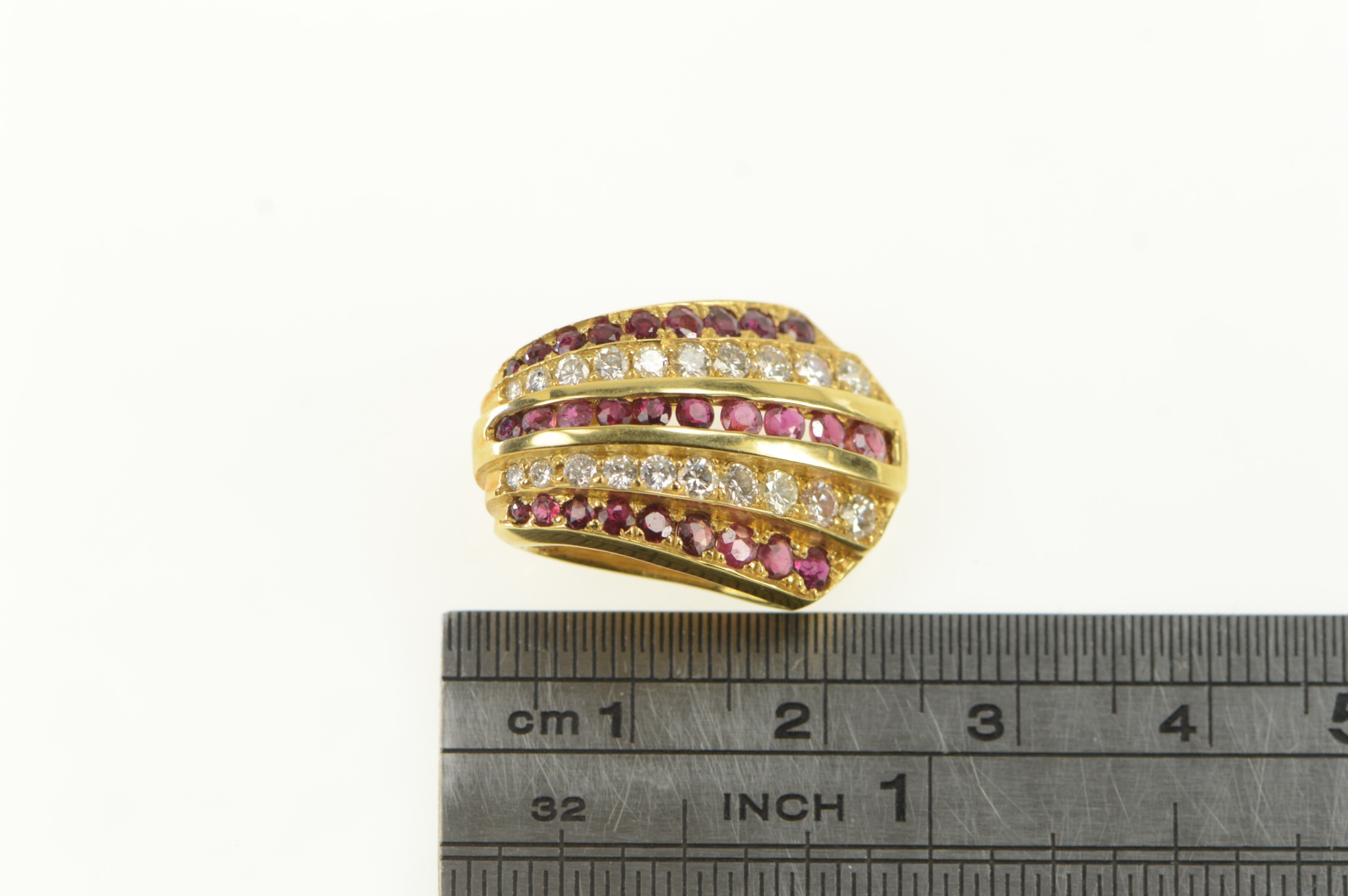 Gem Stone:  1.12 Ctw=28x Ruby (2.2-2.5mm) 0.50 Ctw=20x Diamond G-I, SI