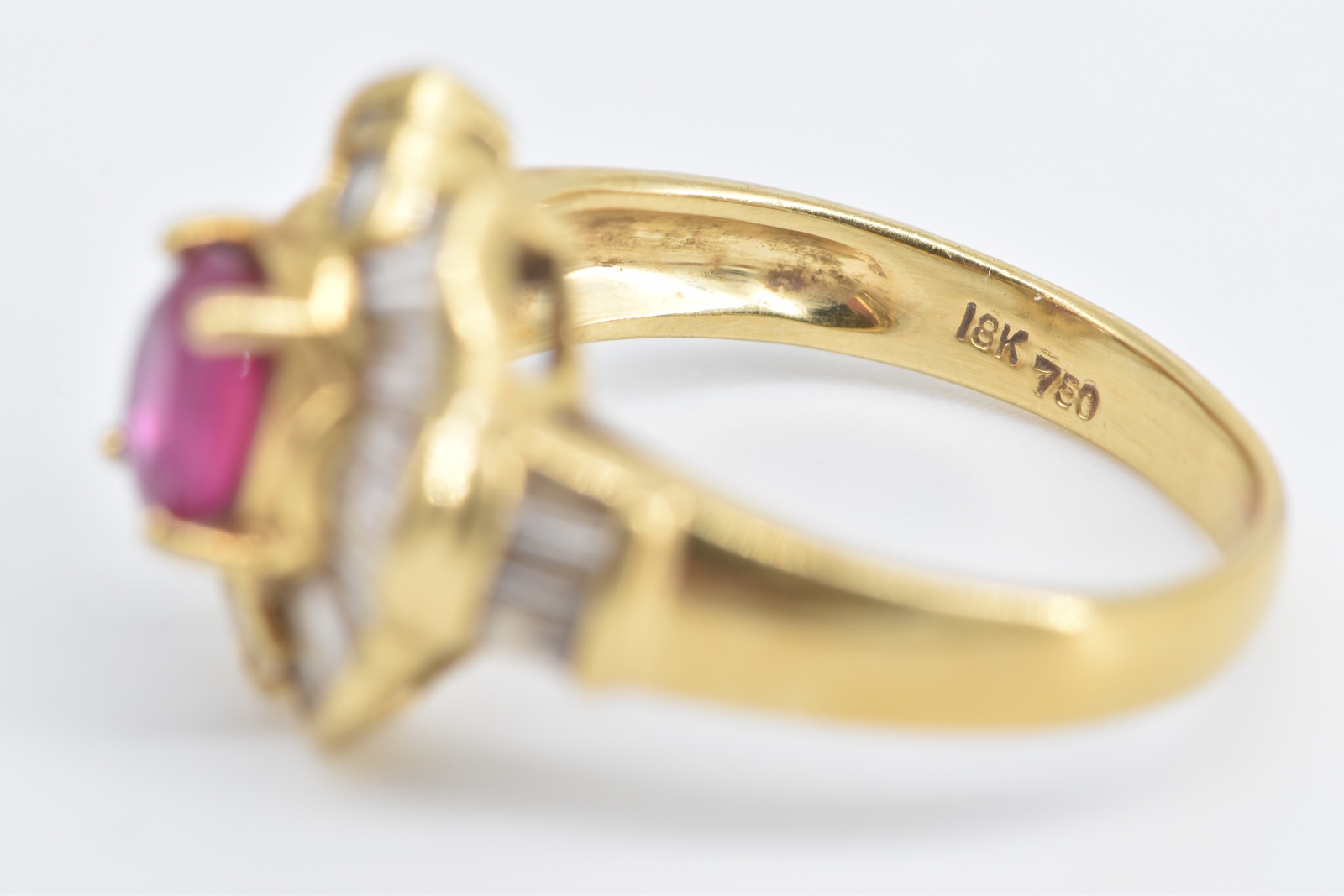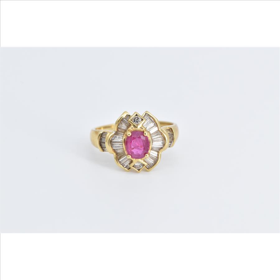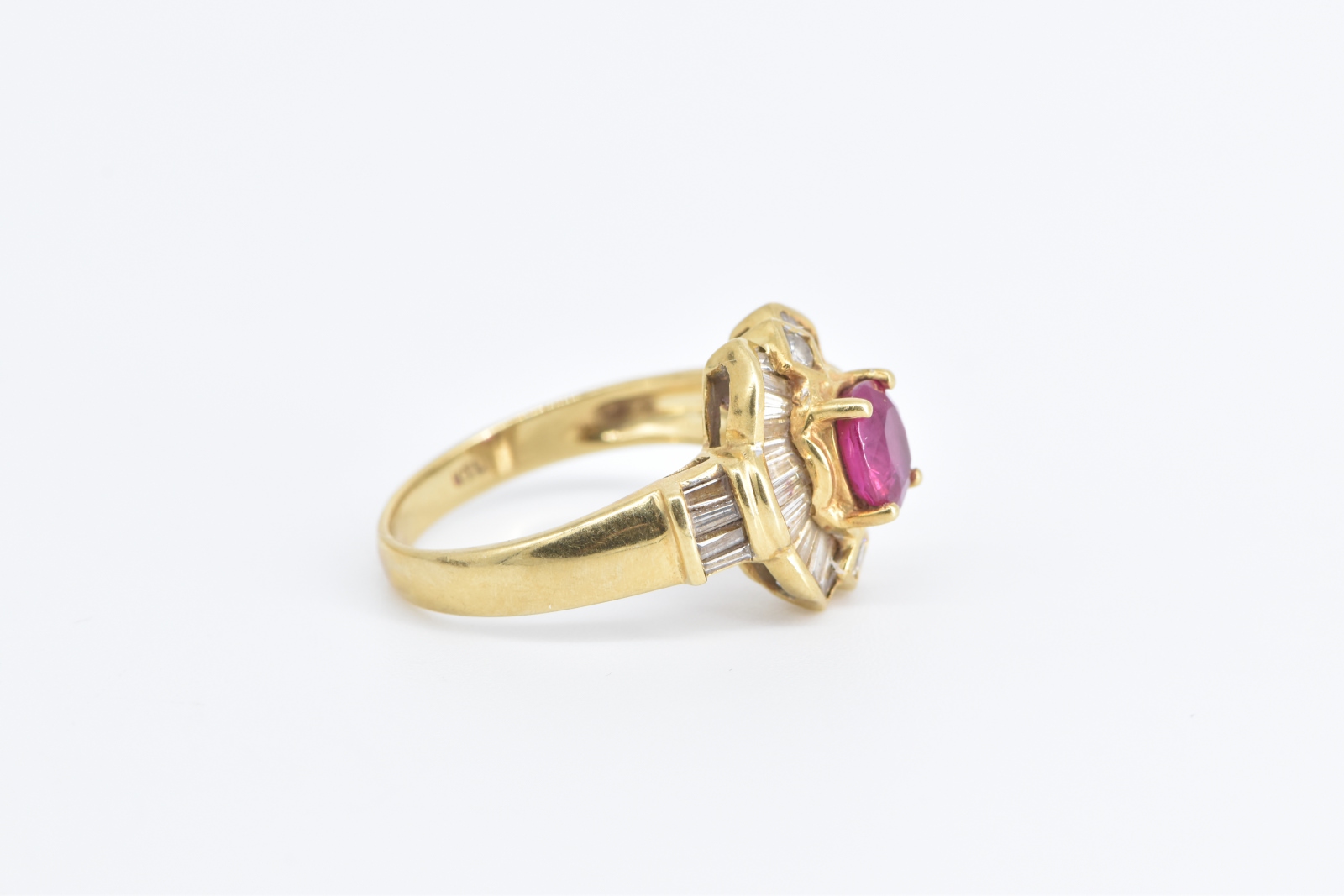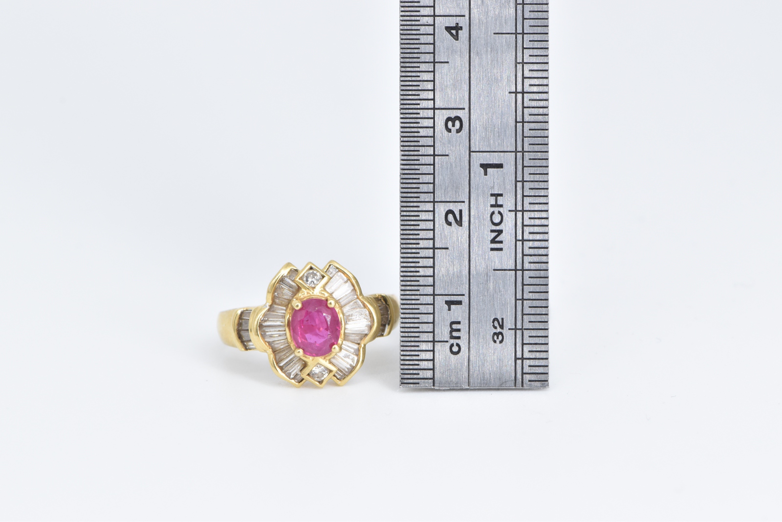 18K 1.80 Ctw Natural Ruby Baguette Diamond Halo Yellow Gold Ring, Size 7