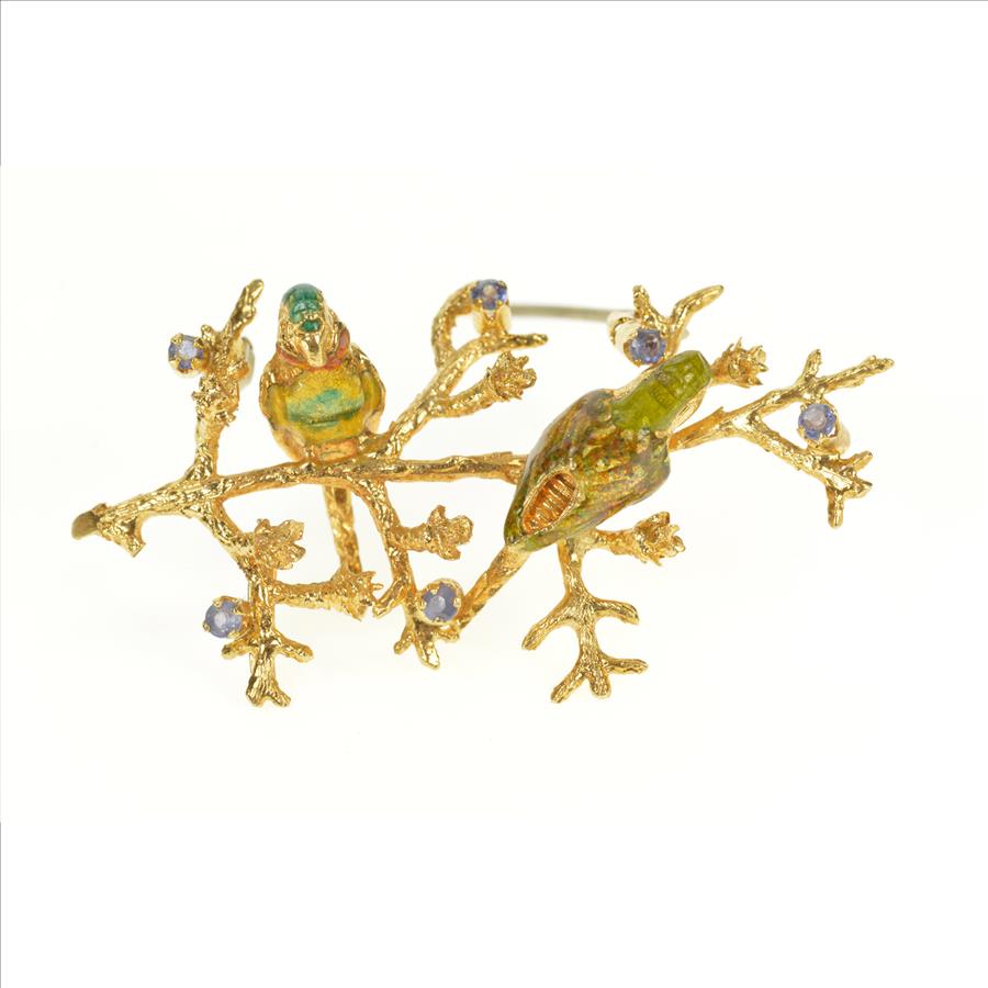 Item:  18K 1960's Ornate Enamel Bird Tanzanite Statement Yellow Gold Pin/Brooch