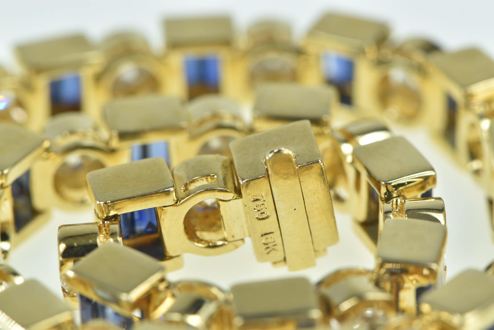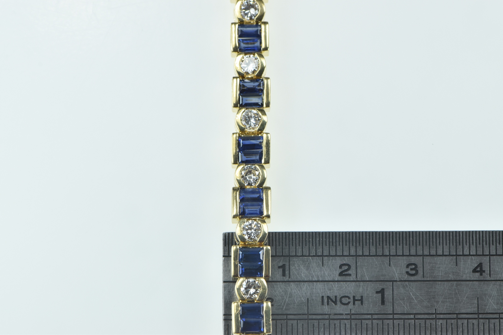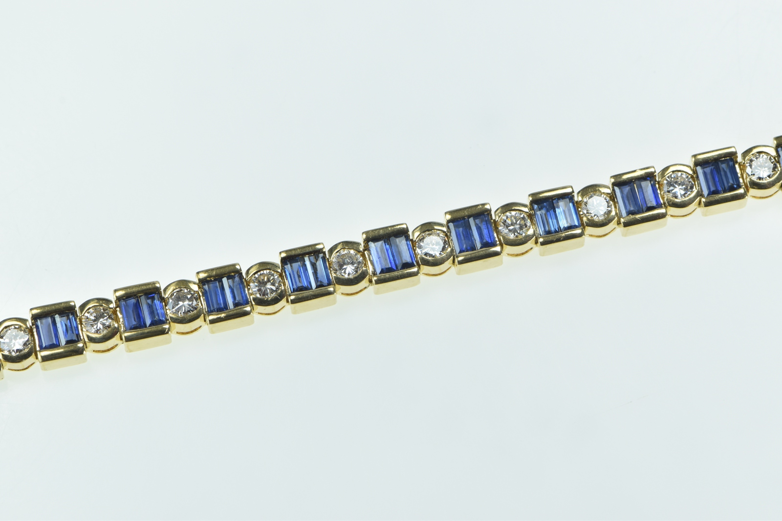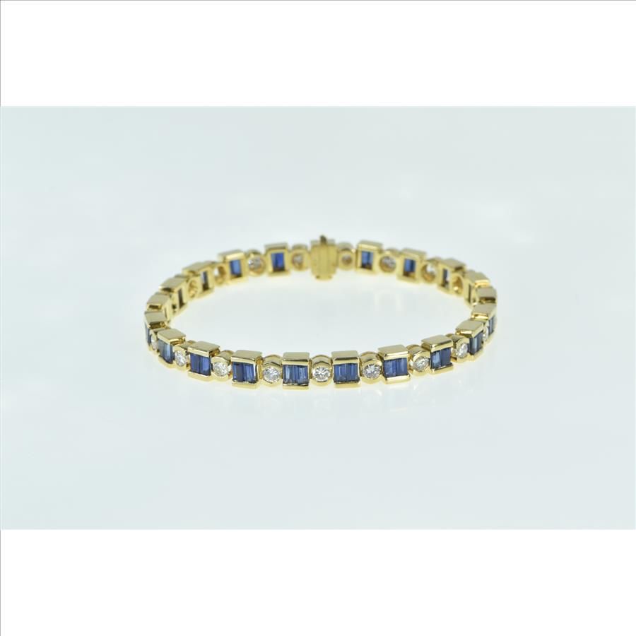 Item:  18K 6.45 Ctw Baguette Sapphire Diamond Tennis Yellow Gold Bracelet 7"