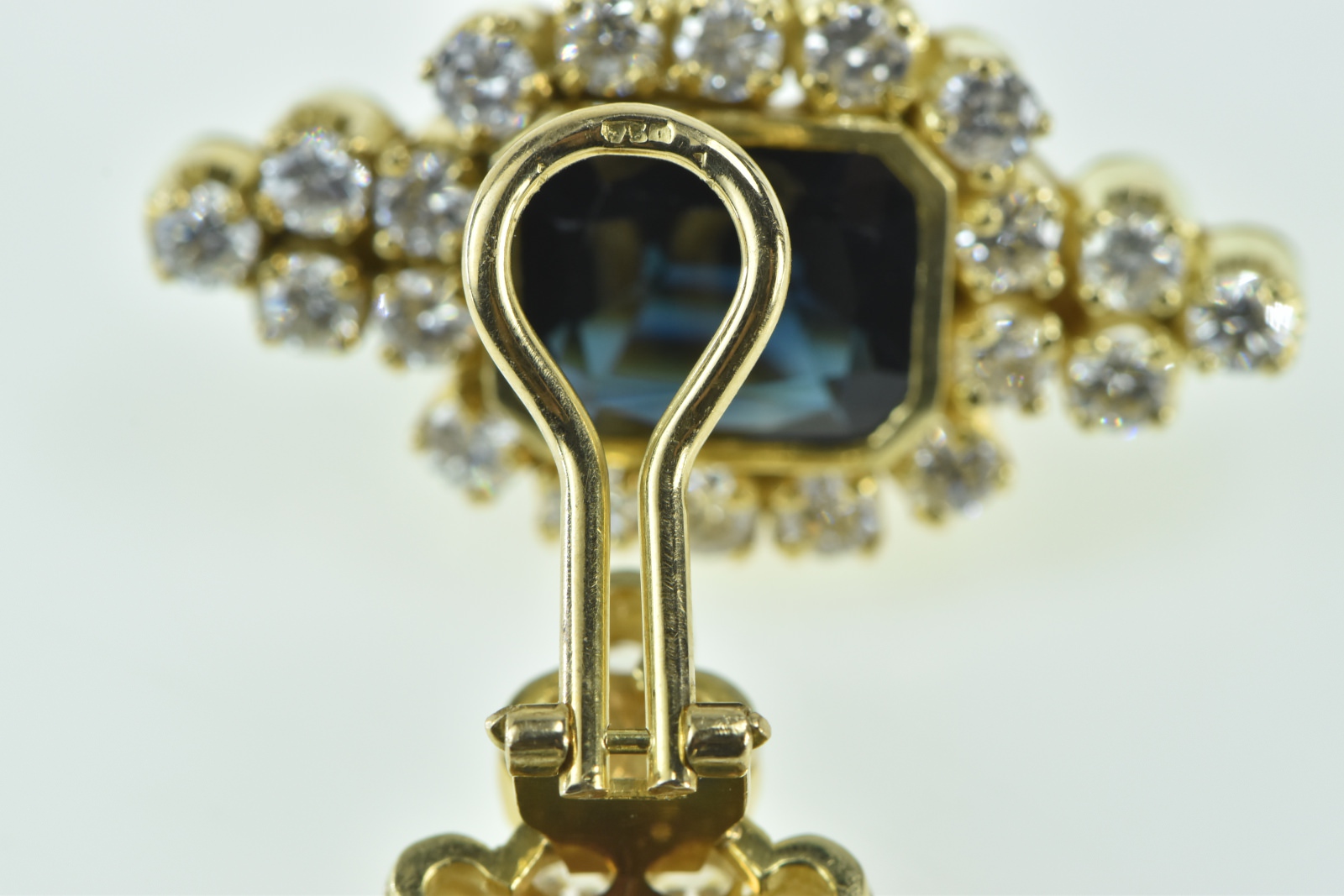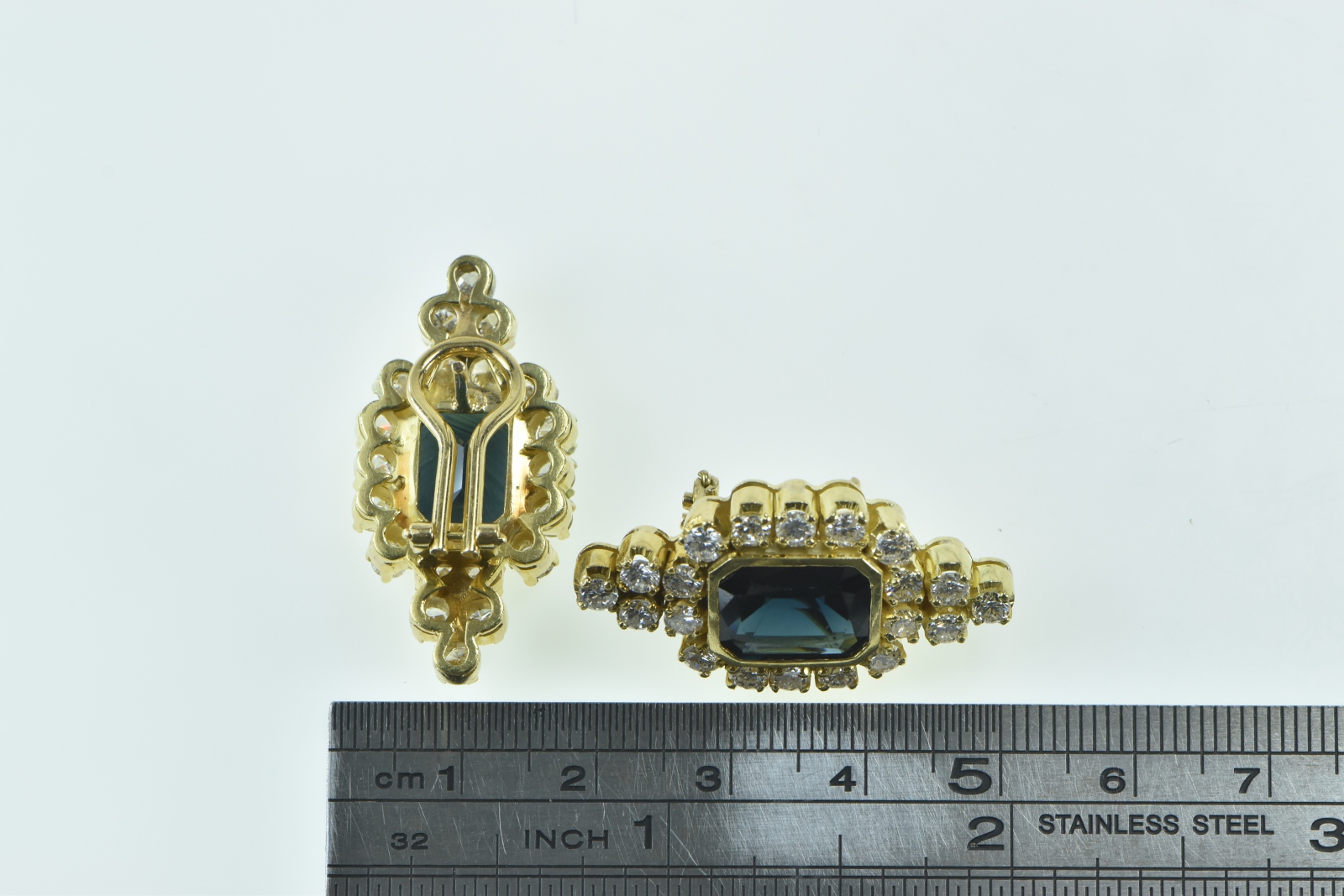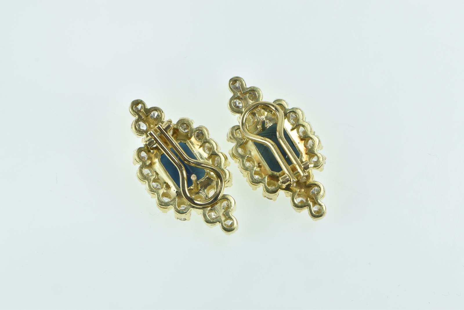 Item:  18K 7.74 Ctw Emerald Cut Sapphire Diamond Halo Yellow Gold Earrings