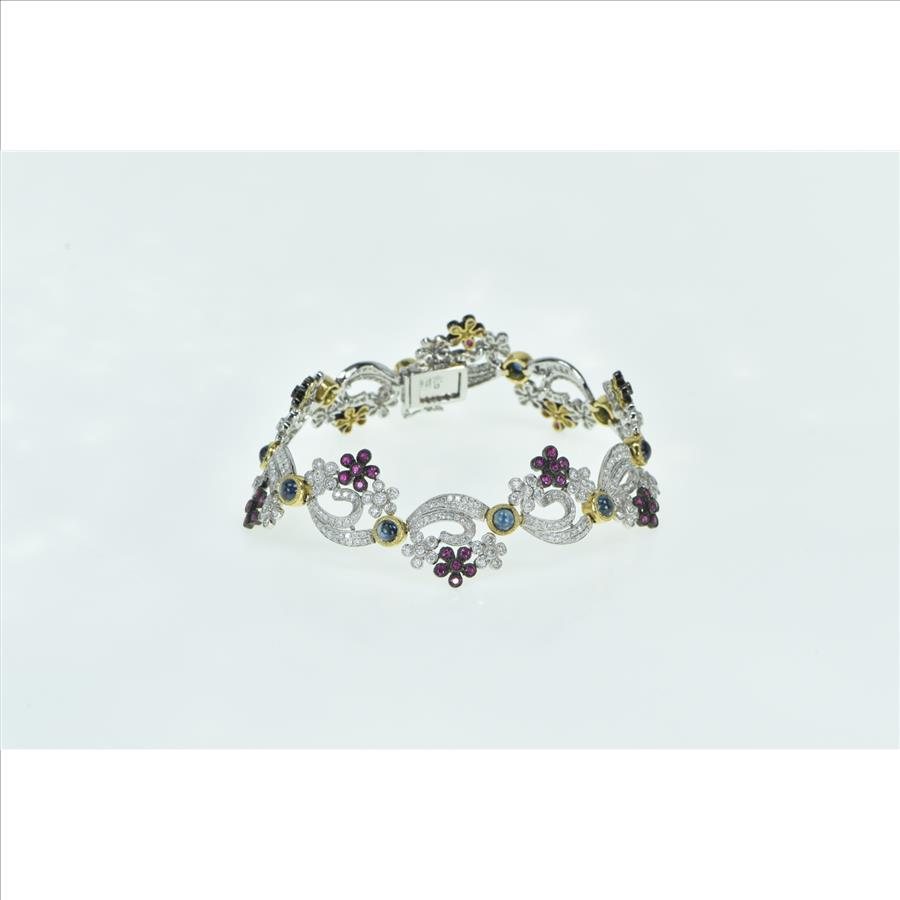 Item:  18K 9.40 Ctw Diamond Ruby Sapphire Floral Swirl White Gold Bracelet 7.5"