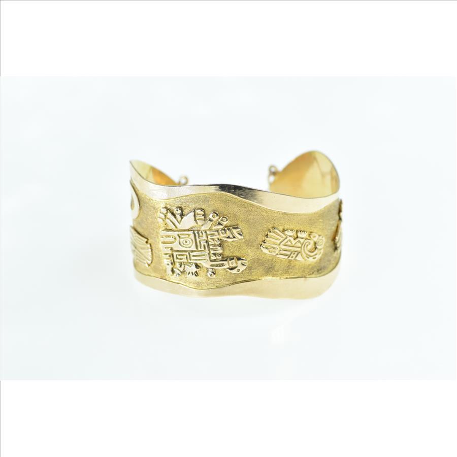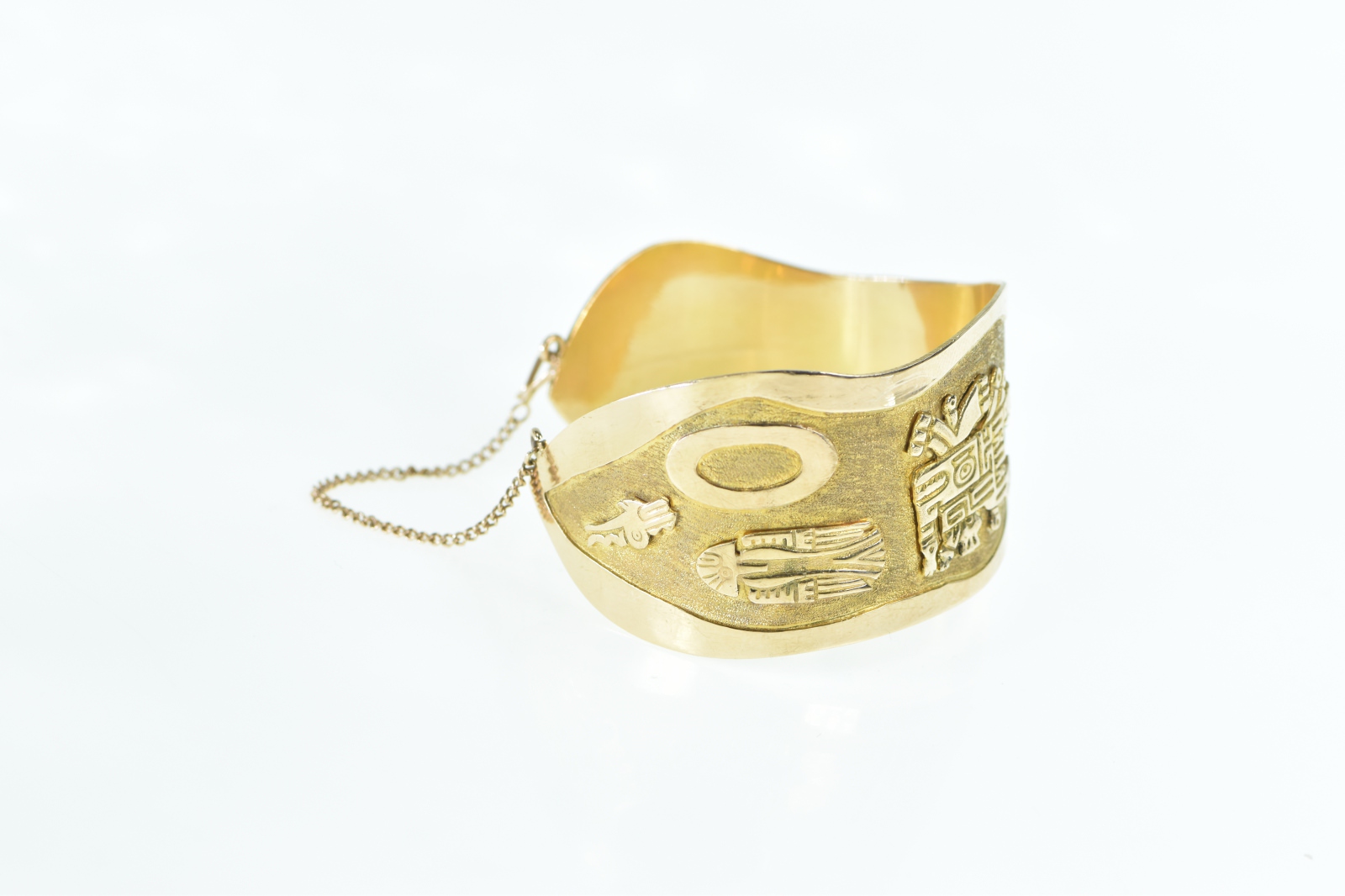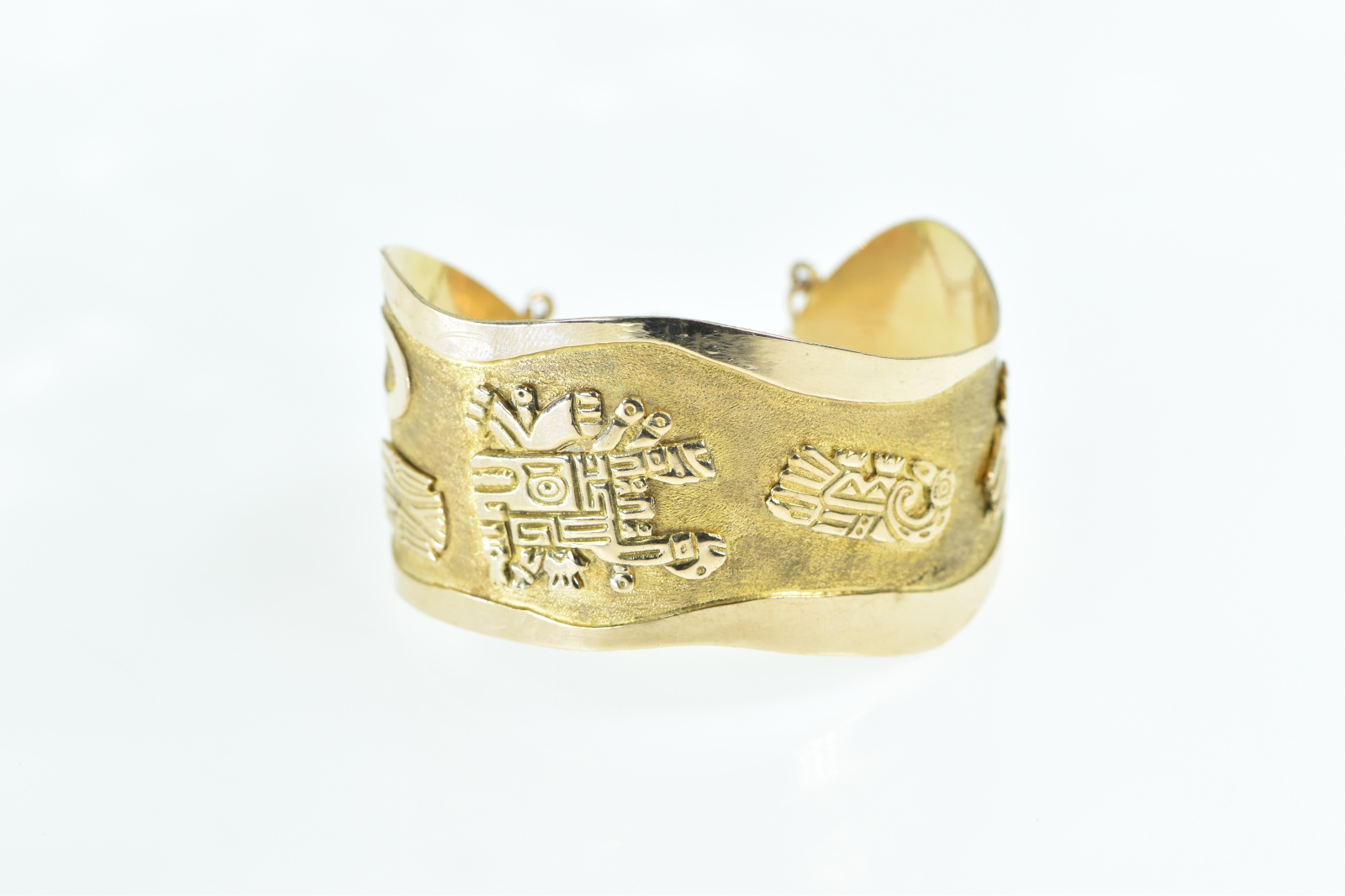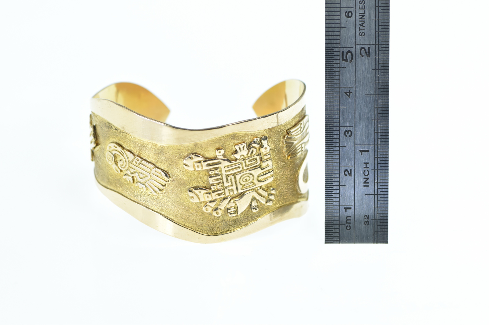 Item:  18K Aztec Ornate Tribal Pattern Cuff Yellow Gold Bracelet 6.75"