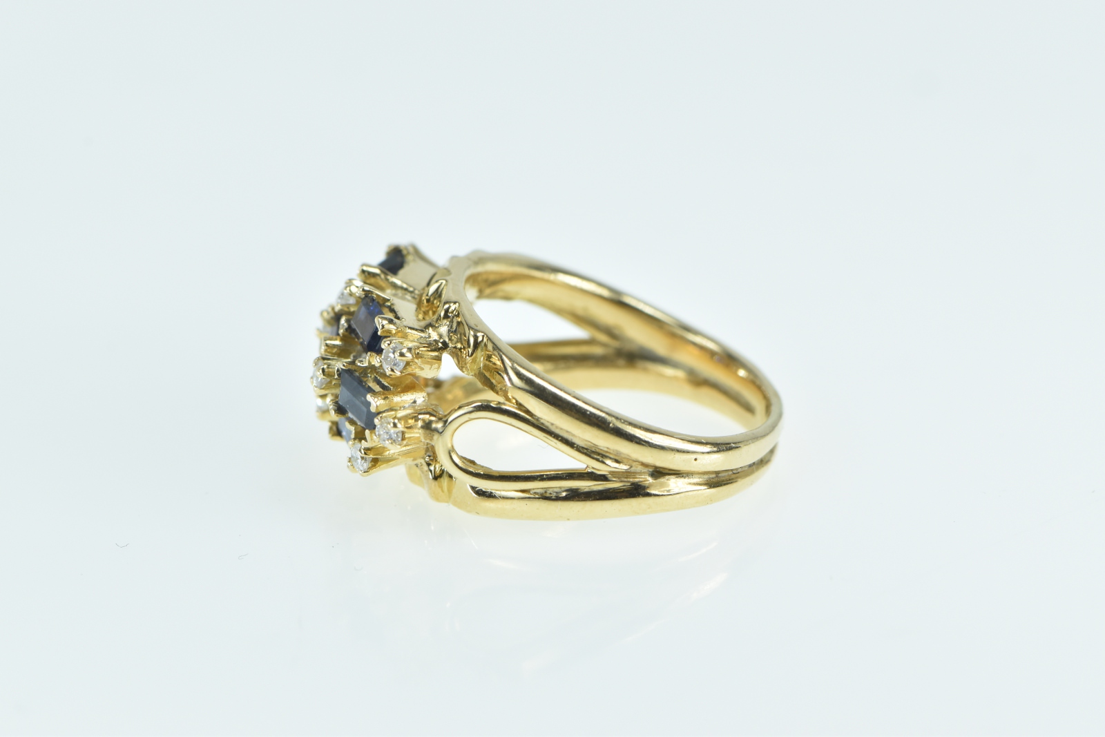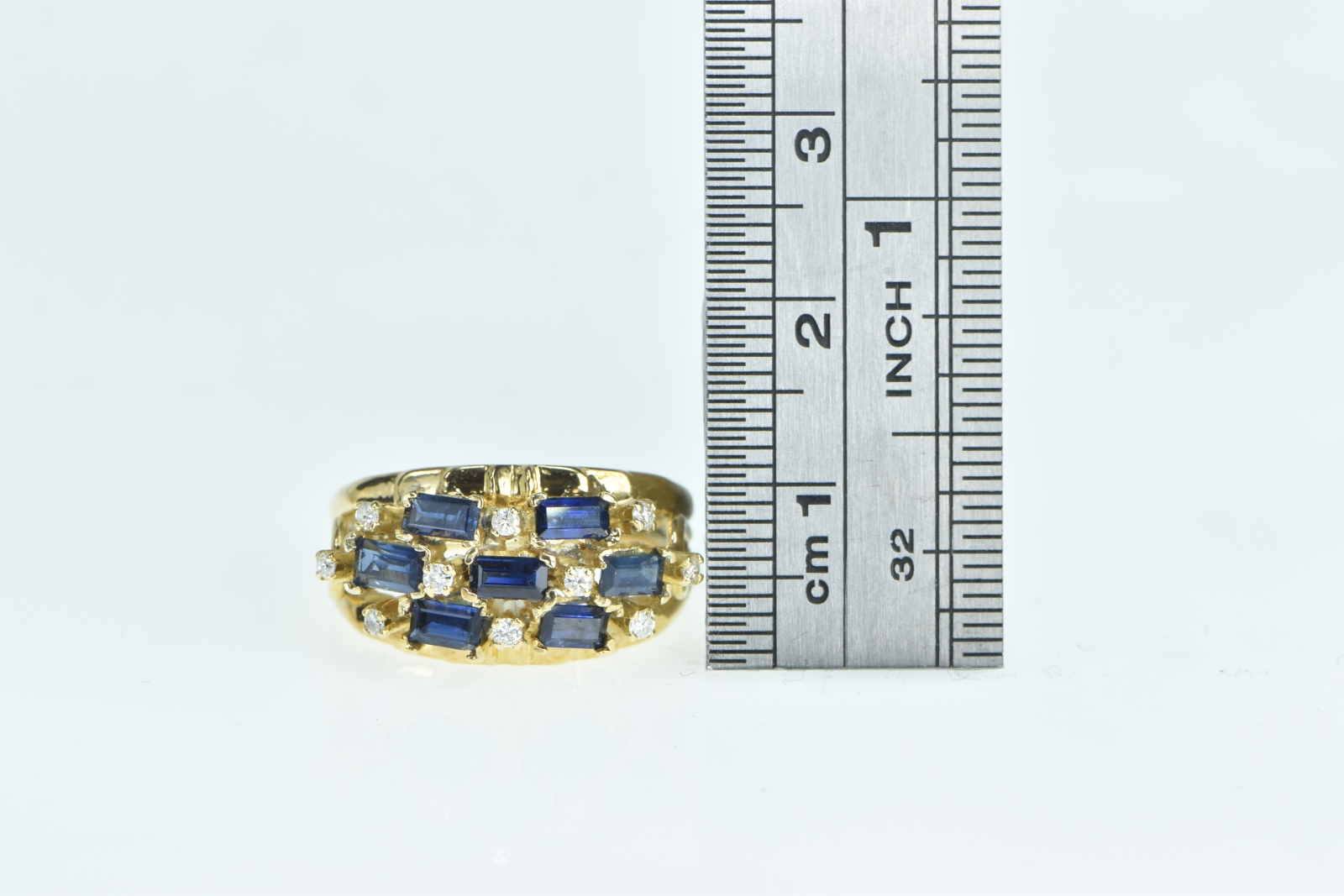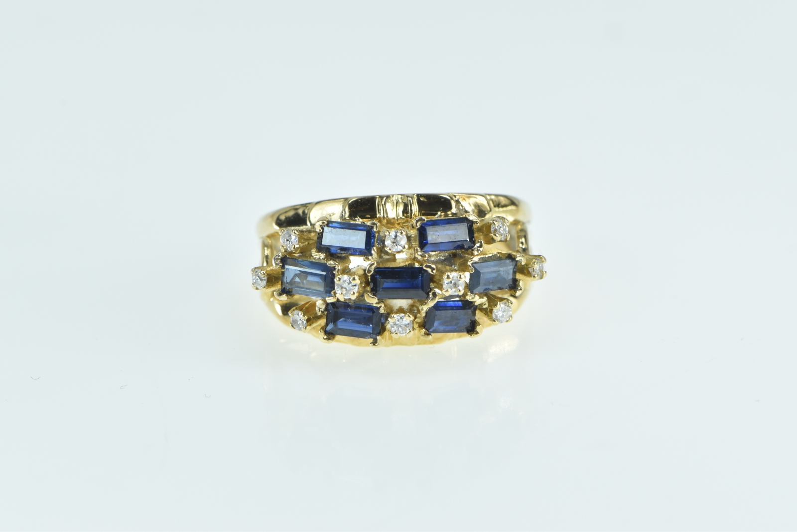 Item:  18K Baguette Sapphire Diamond Checkered Yellow Gold Ring, Size 6.25