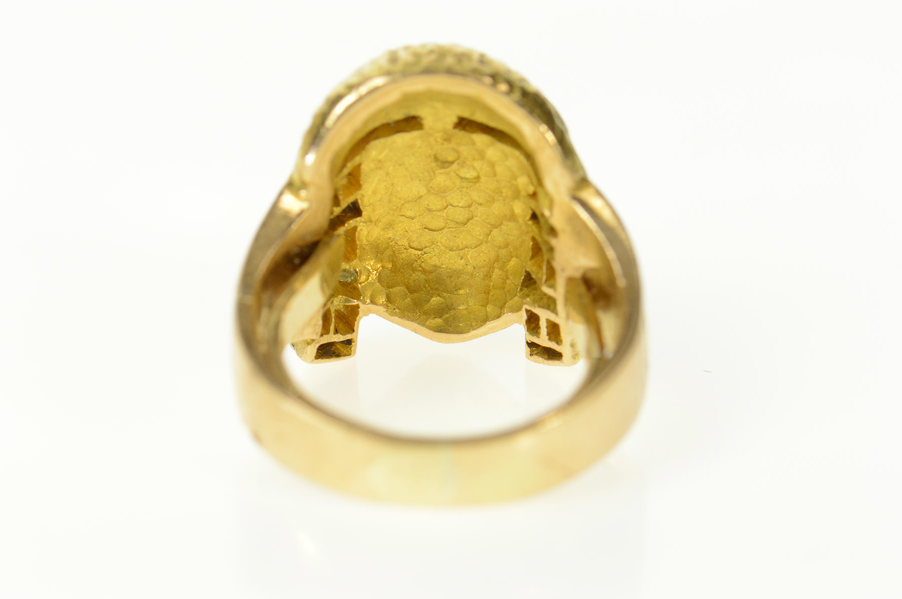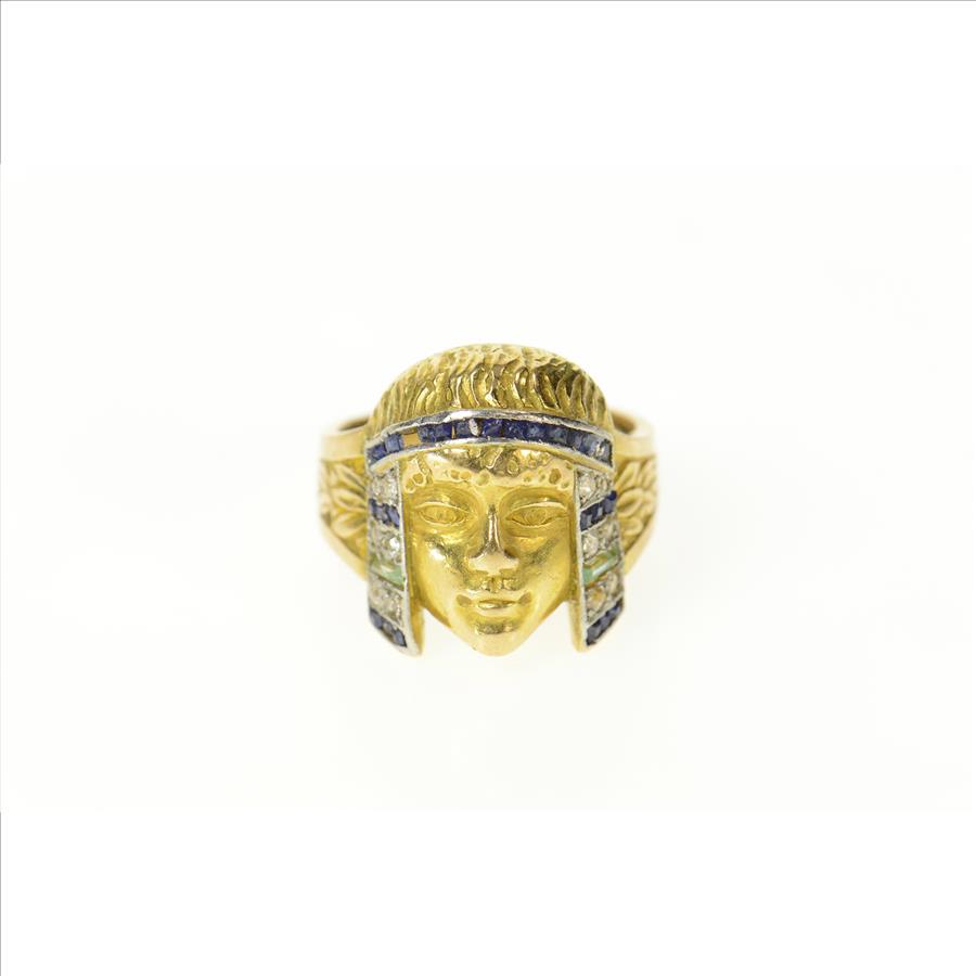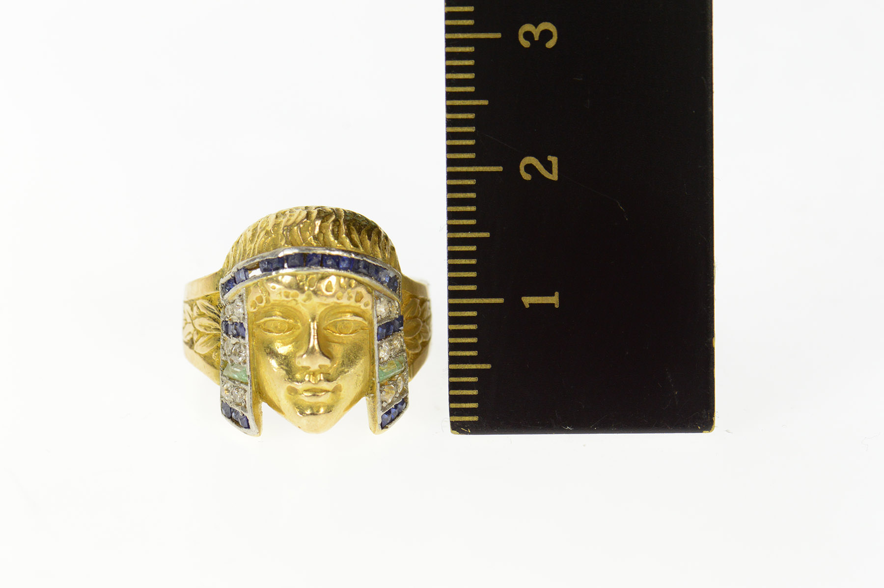 Item:  18K Egyptian Diamond Sapphire Emerald Cleopatra Yellow Gold Ring, Size 3.5