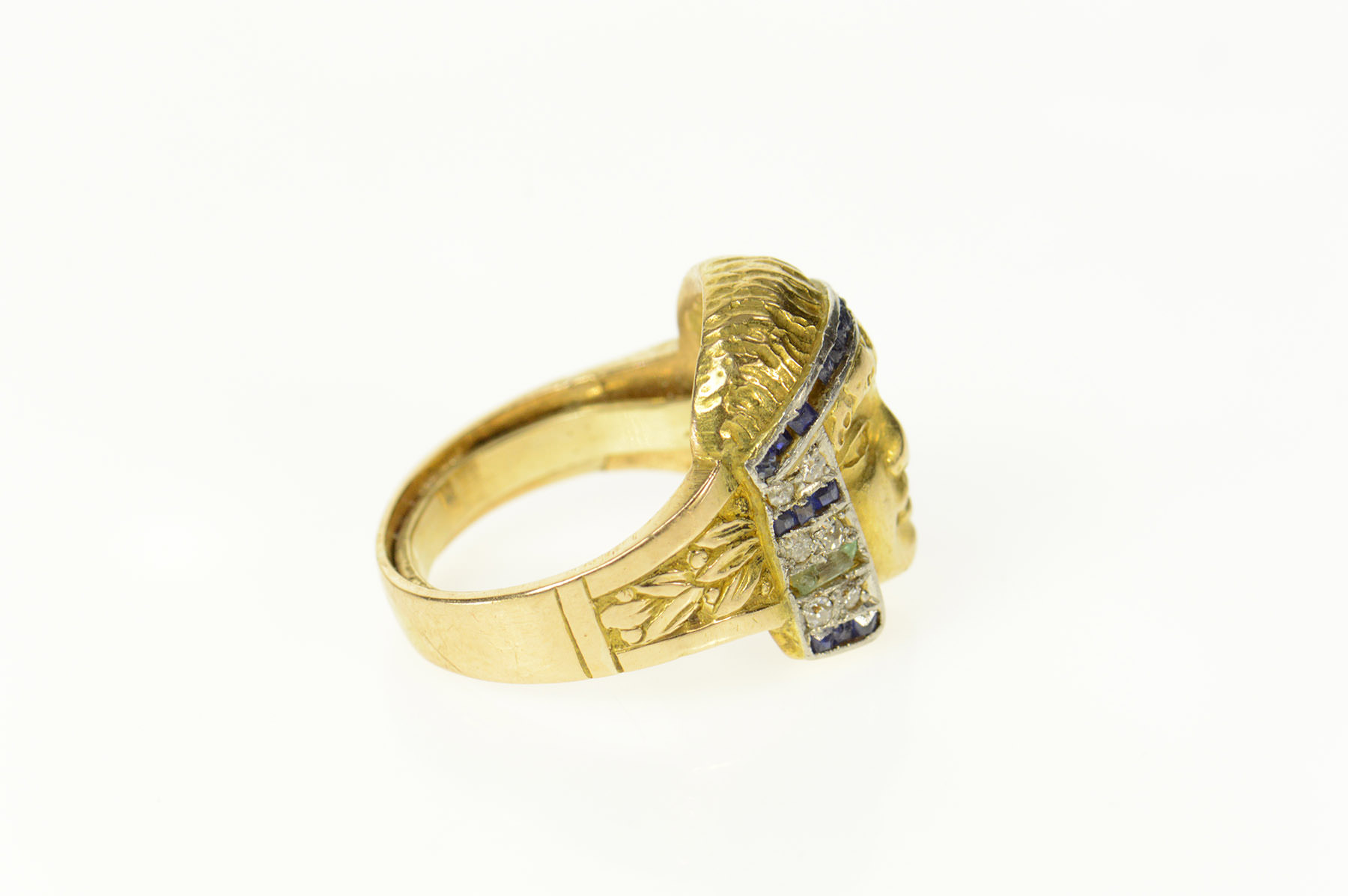 18K Egyptian Diamond Sapphire Emerald Cleopatra Yellow Gold Ring, Size 3.5