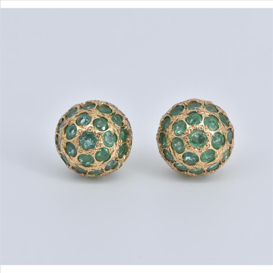 Item:  18K Emerald Encrusted Round Vintage Stud Yellow Gold Earrings