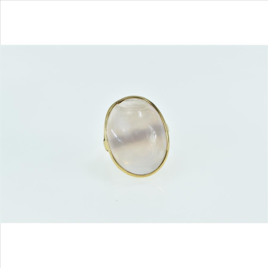 Item:  18K Oval Rose Quartz Cabochon Statement Yellow Gold Ring, Size 8.75