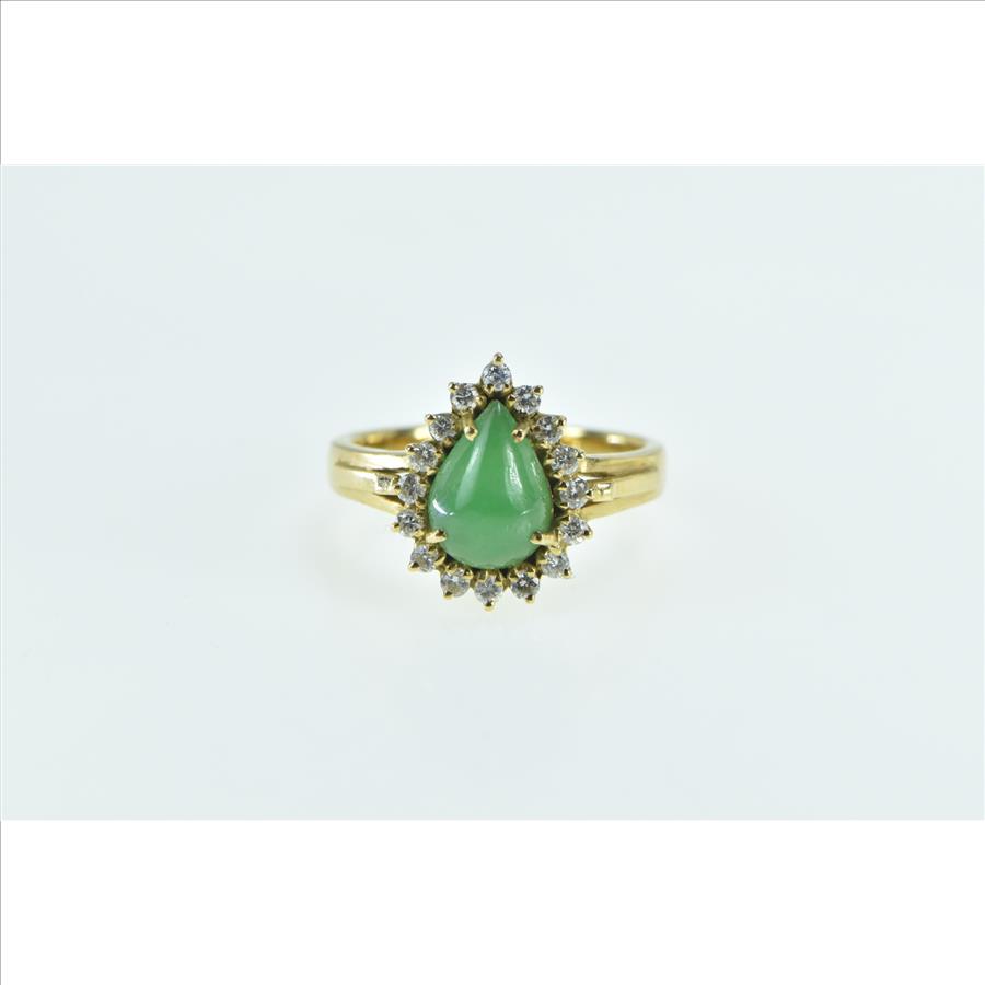 Item:  18K Vintage Pear Cut Jade Diamond Halo Engagement Yellow Gold Ring, Size 6.5