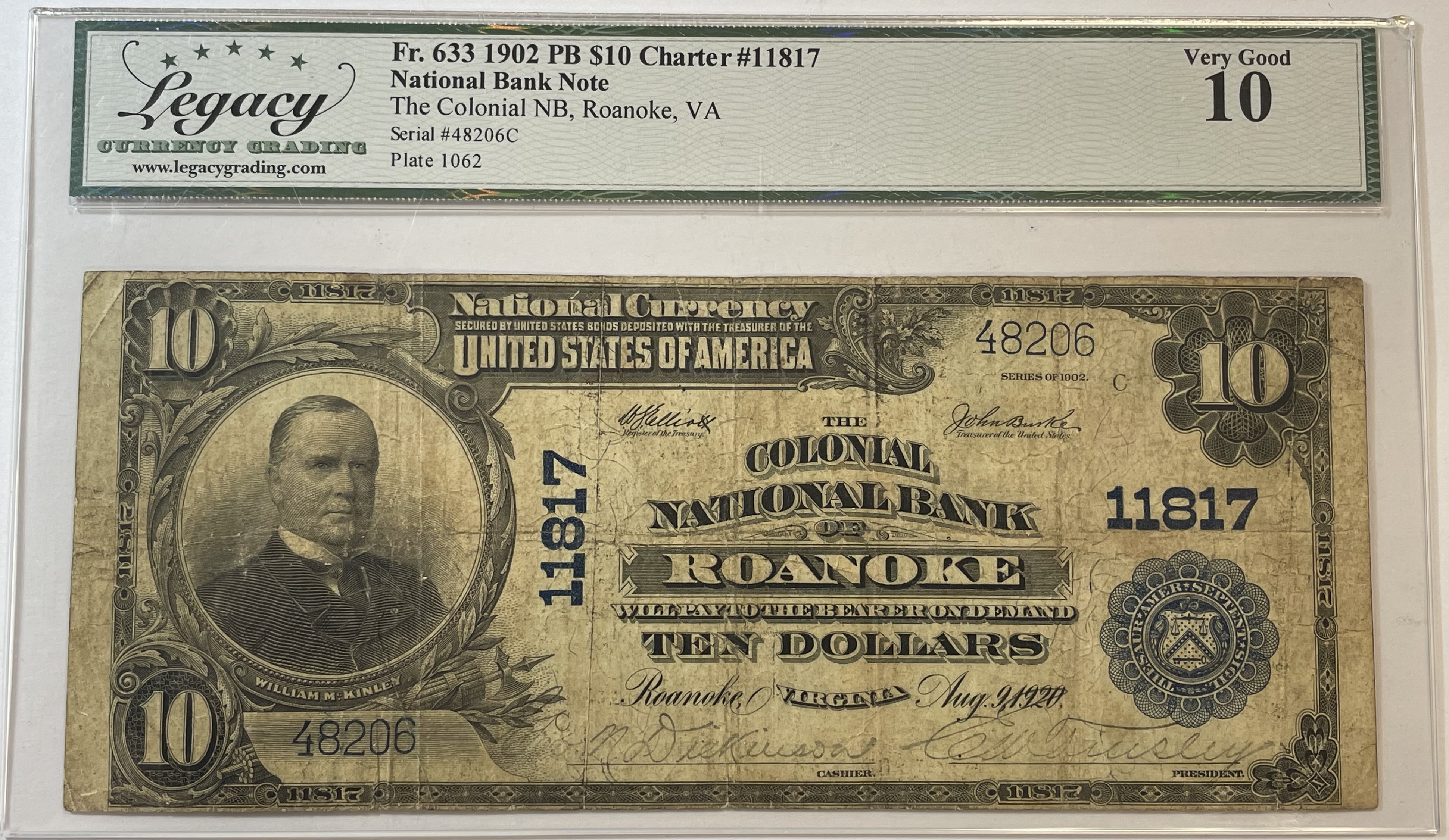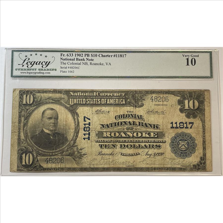 1902 $10 Plain Back Colonial National Bank of Roanoke, VA - Charter #11817 - Legacy Graded VG10