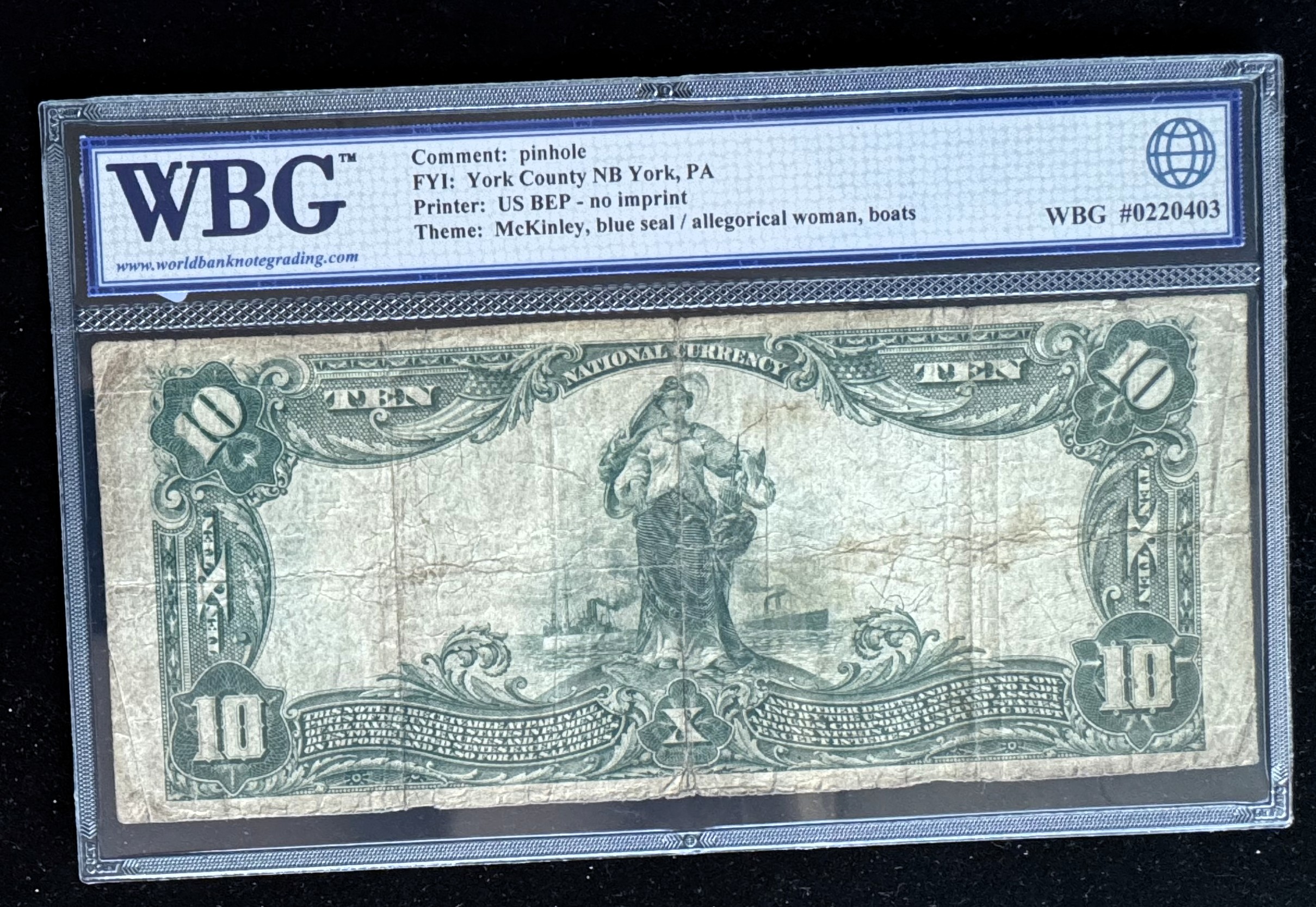 1902 SERIES $10 DOLLAR NATIONAL CURRENCY, YORK COUNTY, PA. E 694, SCARCE WBG GRADED 12 FINE, BLUE SEAL