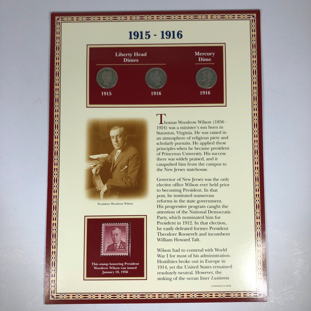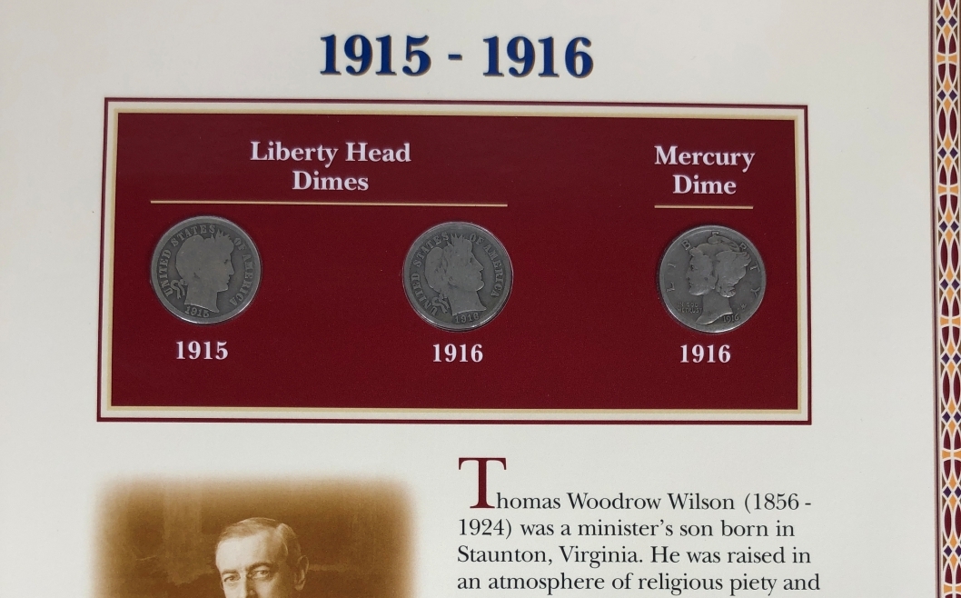 1915-1916 Silver Mercury & Barber Dimes on Informative Display Board